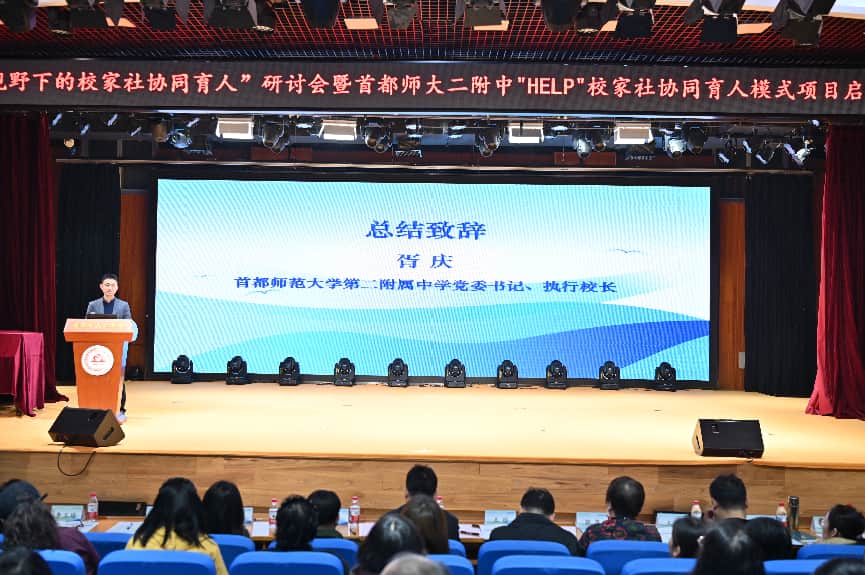 3月25日,“五育融合视野下的校家社协同育人”研讨会在首都师范大学第二附属中学举行,与会专家教师围绕“五育融合”背景下校家社协同育人的理念深化、机制建设与实践路径开展深入研讨。会上,由首都师范大学教育学院学习科学团队发起的“HELP”校家社协同育人模式项目正式启动,首师大二附中作为首批合作实施学校同步启动项目实践。