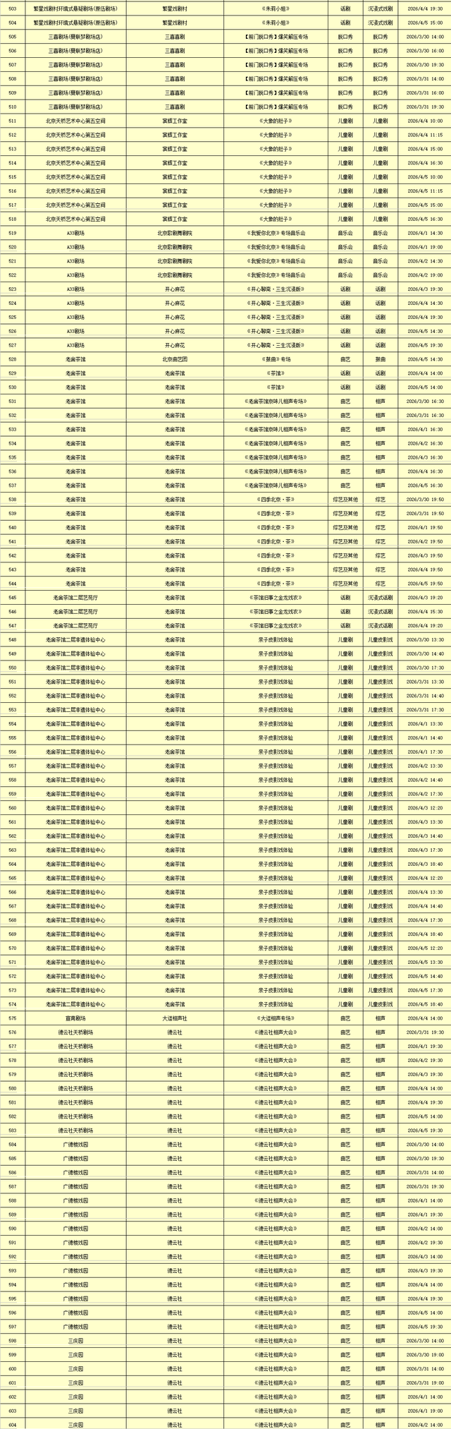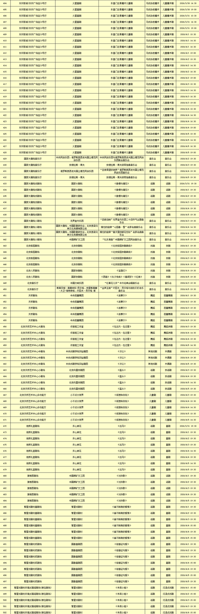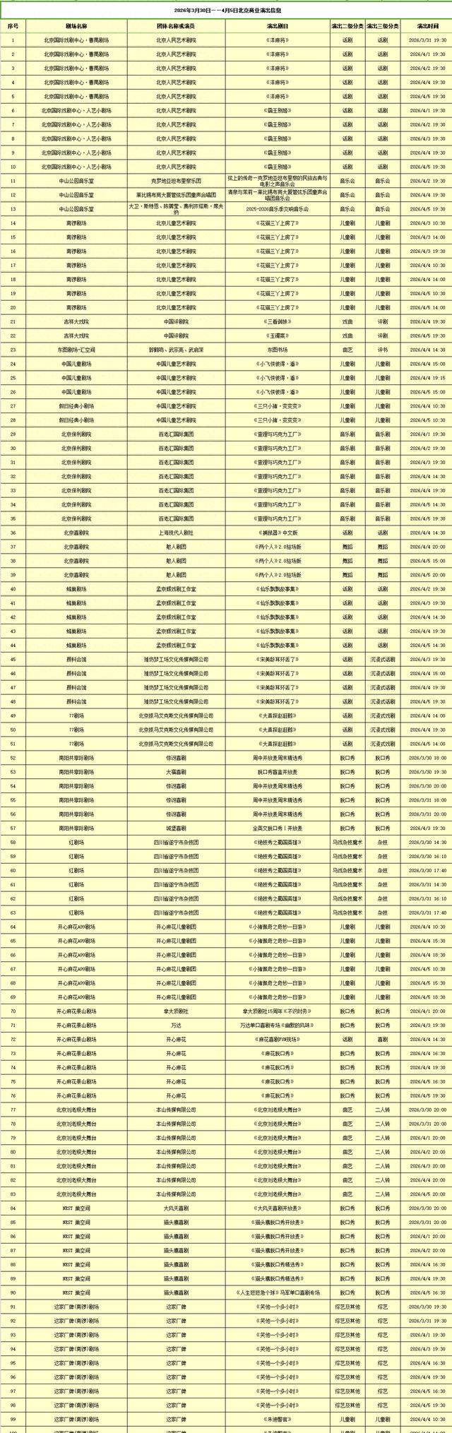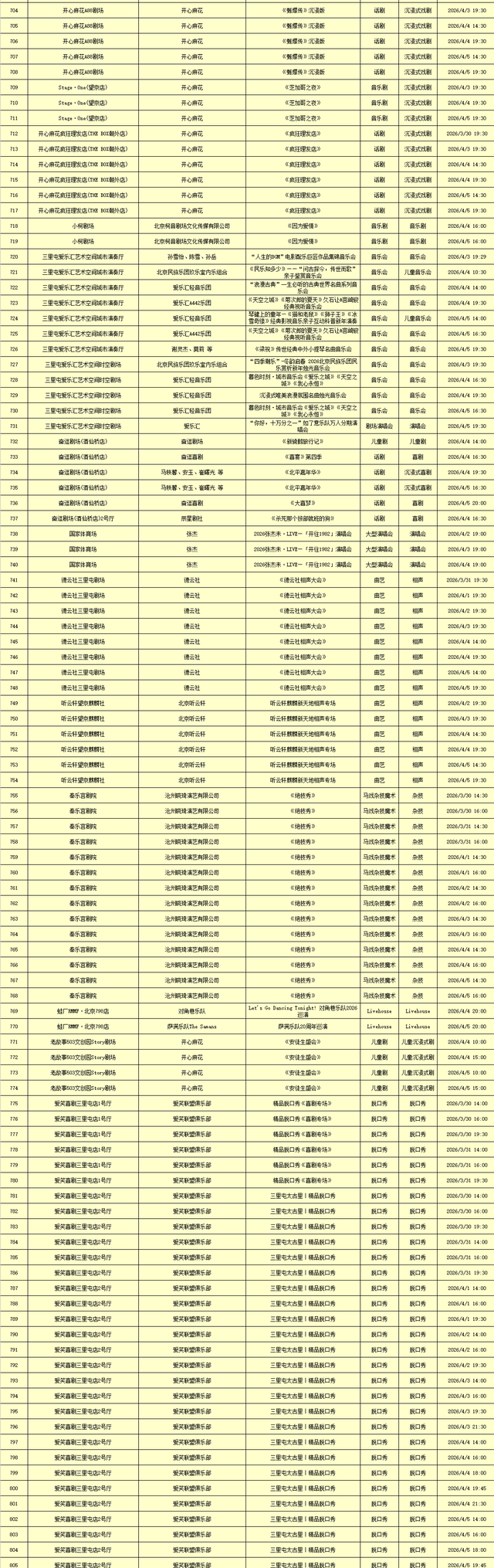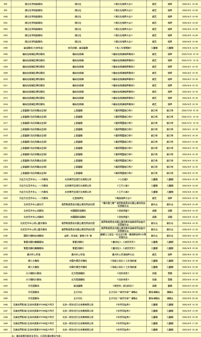 2026年3月30日-2026年4月5日北京商业演出信息新鲜“出炉”!话剧、喜剧、京剧、昆曲、北京曲剧、音乐剧、儿童舞台剧、儿童亲子剧、儿童木偶剧、儿童音乐剧、儿童剧、儿童魔术剧、儿童杂技、沉浸式戏剧、沉浸式喜剧、音乐会、演唱会、Livehouse、芭蕾舞剧、相声、评书、鼓曲、曲艺、二人转、脱口秀、综艺、杂技等一大波精彩演出来了,你想看的全都有,安排起来!(演出信息可能发生变化,以实际演出情况为准)