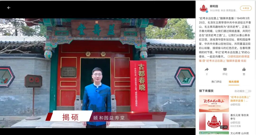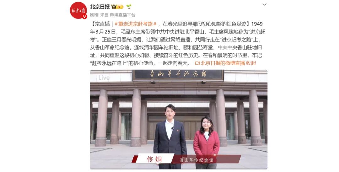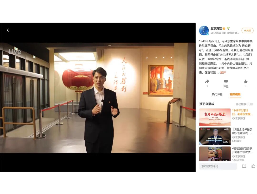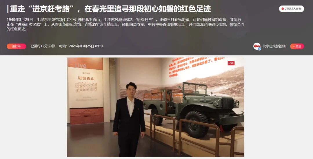 为深入挖掘新中国成立主题片区的历史内涵,生动展现中共中央在香山的革命实践,弘扬“赶考永远在路上”的时代精神,3月25日,香山革命纪念馆联合清华园车站旧址、颐和园益寿堂、中共中央香山驻地旧址(双清别墅)共同举办“赶考永远在路上”融媒体直播活动。此次直播活动采取“主直播间+外景现场”多点联动、实时连线的方式,通过新华社、北京日报、北京时间、海淀区融媒、三山五园艺术中心、香山公园及颐和园等相关单位官方平台联动播出,累计观看量近700万人次,并获市属媒体的广泛报道,进一步推动“赶考”品牌塑造与“赶考”历史立体化传播。