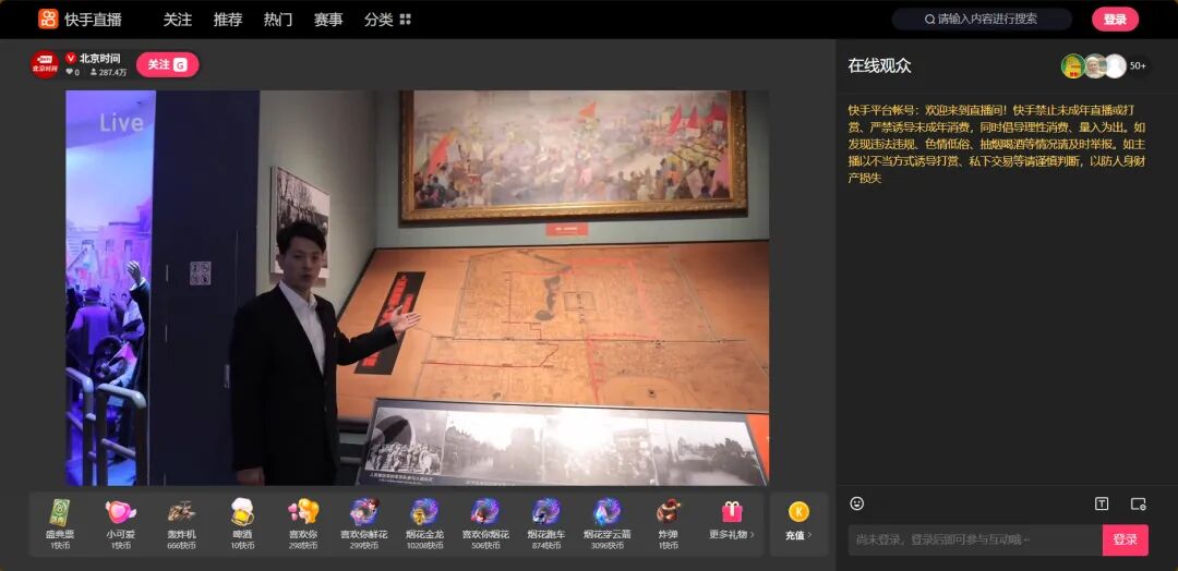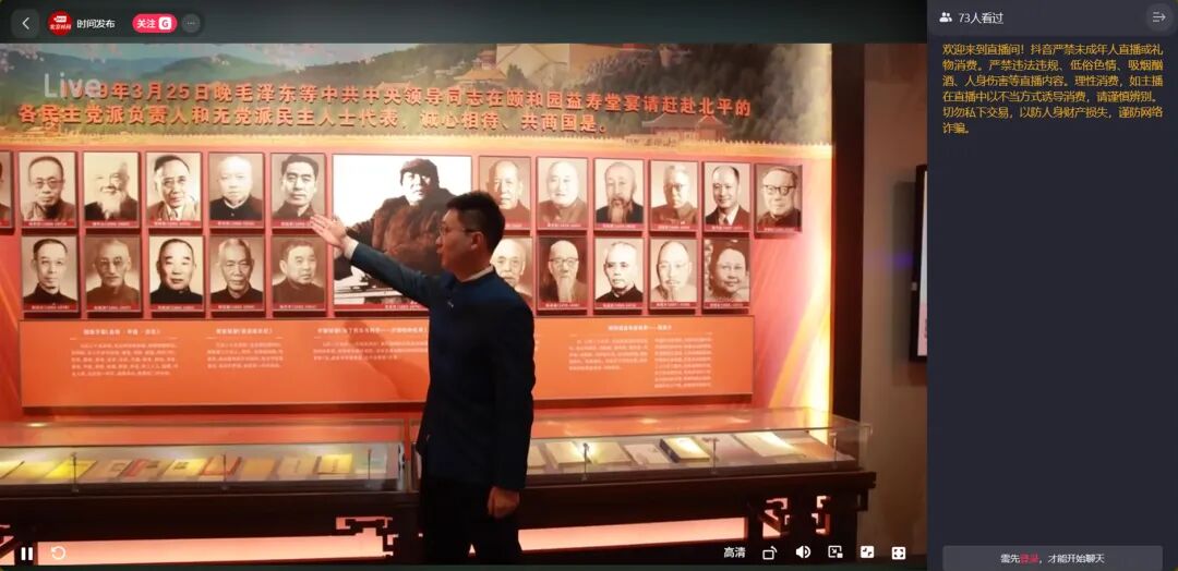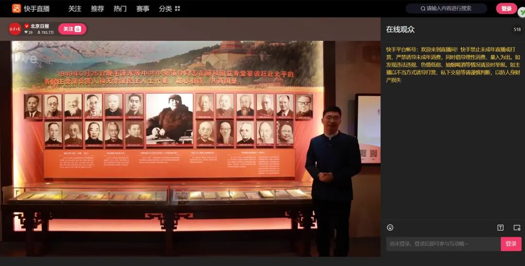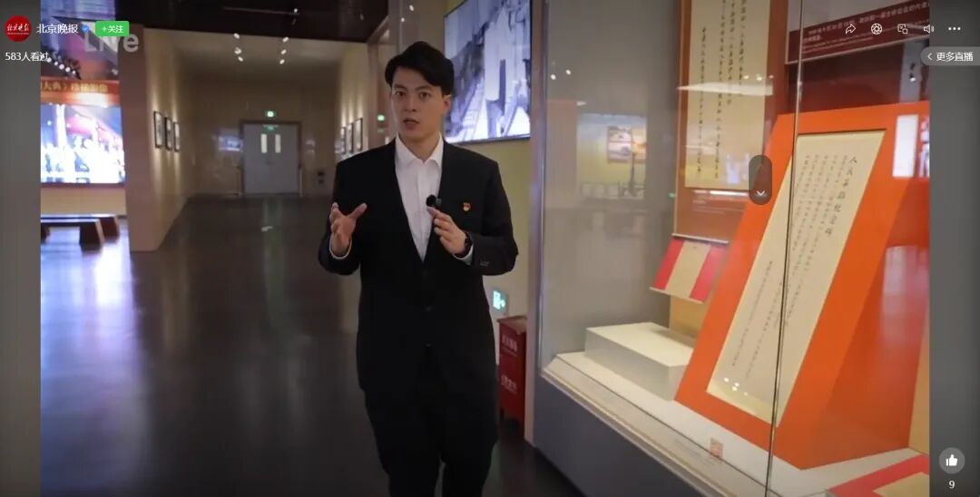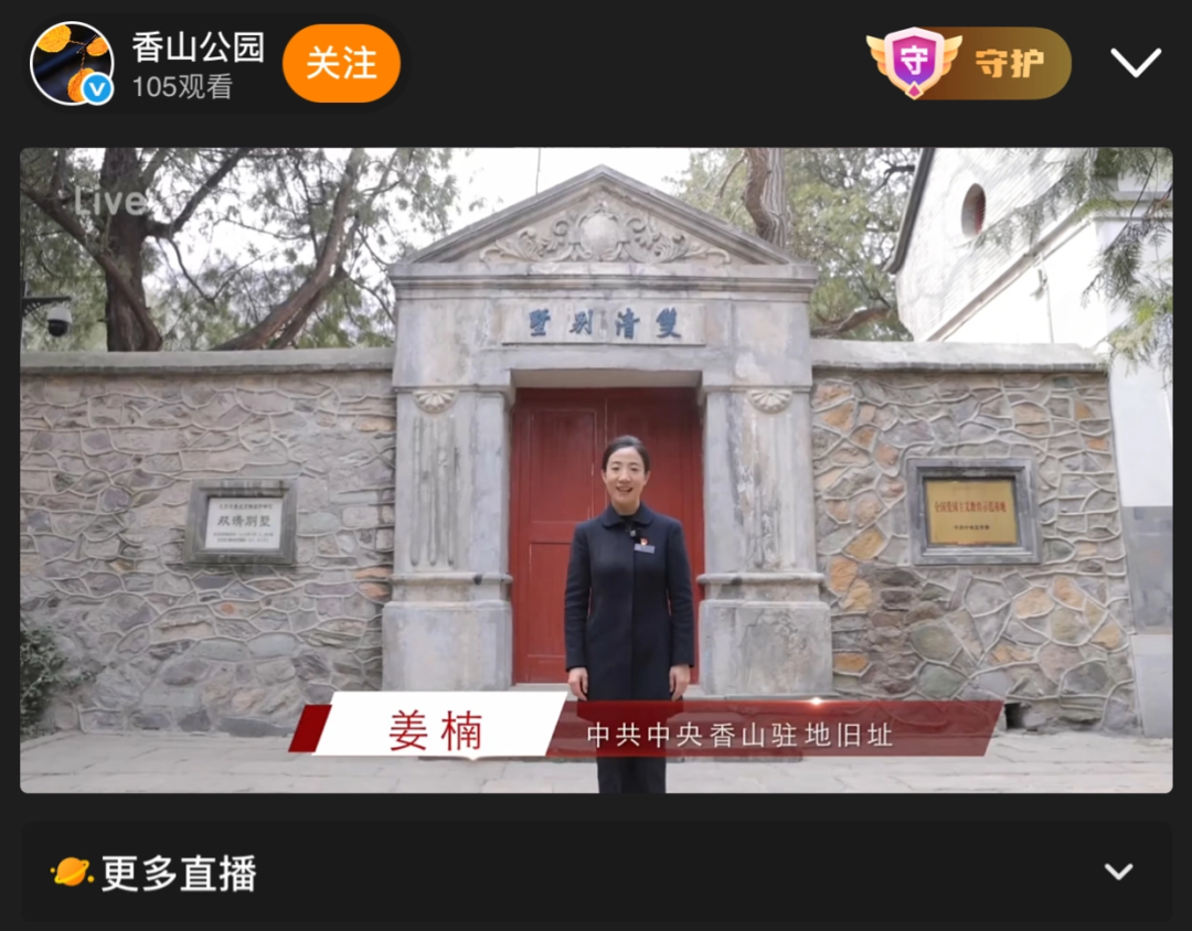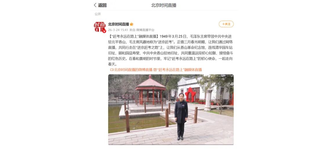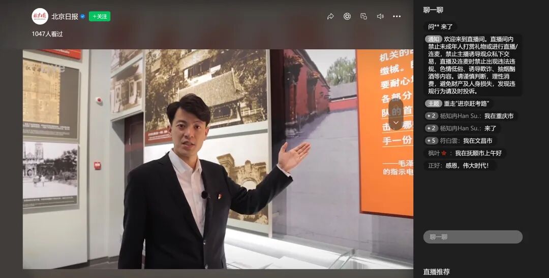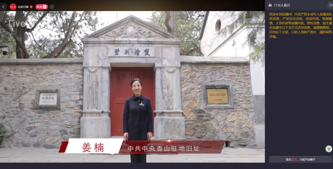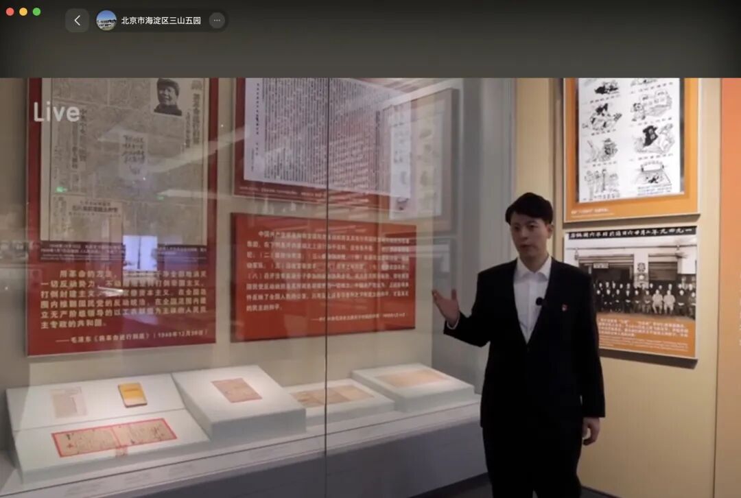 整场直播循着中共中央进京后的历史脉络有序开展。首先连线清华园车站旧址,讲解员立足实景,生动还原毛泽东等中共中央领导同志抵达北平的历史性时刻,让观众直观触摸进京“第一站”的厚重历史;随后走进颐和园益寿堂,讲解员细致讲述西苑阅兵后,中共中央领导同志与各民主党派代表欢聚一堂、共商国是的历史细节,通过“隔空对话”形式,重现毛泽东同志与柳亚子先生的恳切交谈;最后聚焦中共中央香山驻地旧址,讲解员围绕毛泽东同志在双清别墅六角红亭前阅读《进步日报》、起草重要电文等经典场景深入讲解,带领观众沉浸式感悟革命先辈擘画新中国宏伟蓝图的历史瞬间。