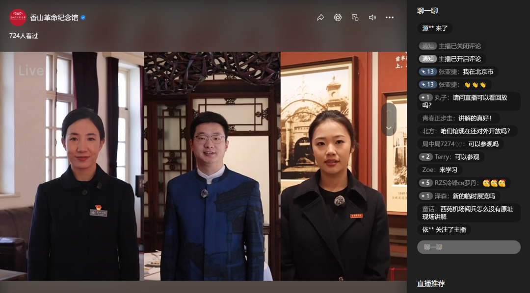 活动尾声,各地讲解员以分屏形式依次诵读习近平总书记视察北京香山革命纪念地时提出的“三个缅怀”寄语,在庄重肃穆的氛围中传递初心使命的时代回响。整场直播语言凝练、衔接自然,既保持学术严谨性,又以通俗平实的表达拉近了与观众的距离,实现了红色历史与融媒传播的深度融合。