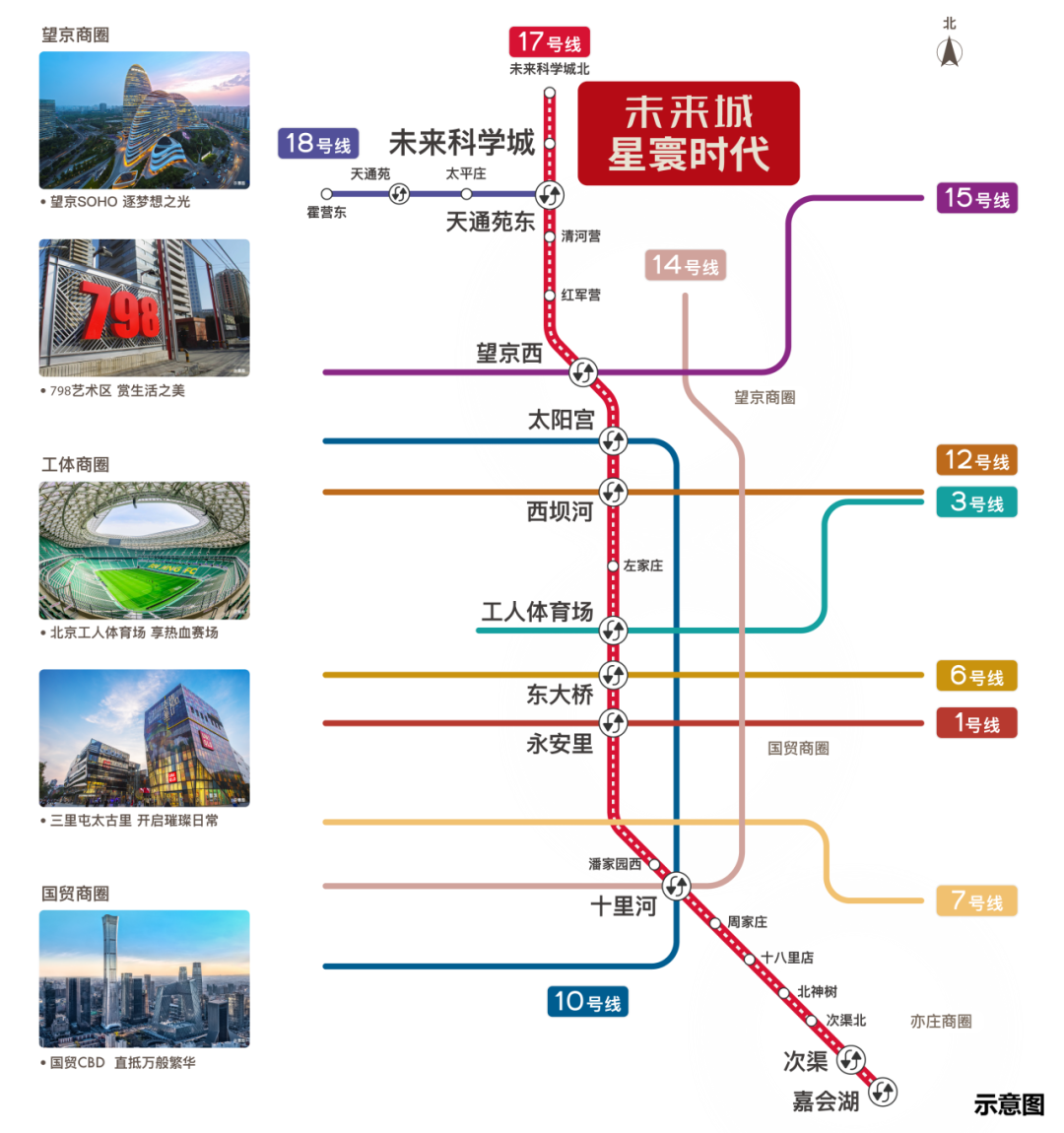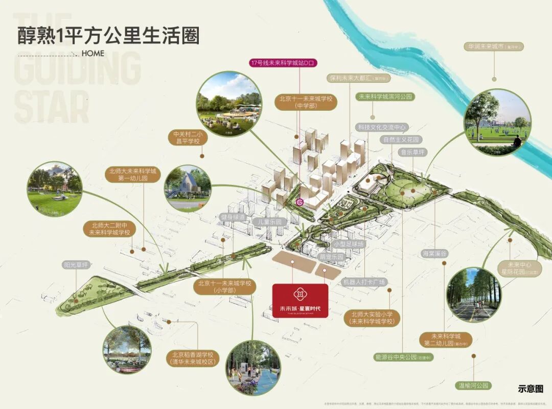 交通上距17号线未来科学城站约400米,可一站换乘18号线直达海淀,半小时接驳核心城区。生活上,周边一公里内的六所成熟学校涵盖从幼儿园到高中15年学制,1.5公里内可达山姆会员店(已运营)、保利时光里等四大商圈,并有三大公园、500 万㎡生态绿地环抱,教育、消费、休闲空间全配齐。
