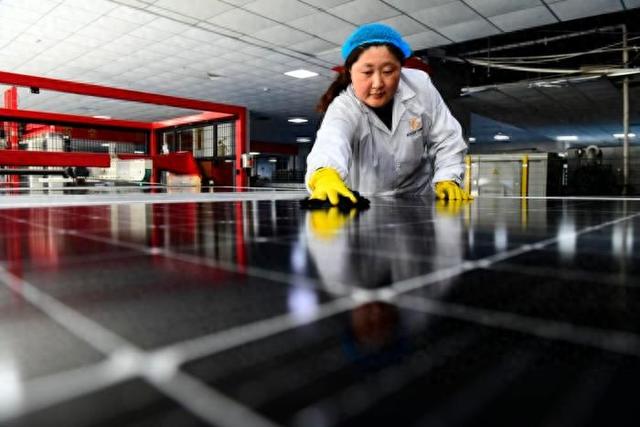 3月27日,在日照市莒县一家企业,工作人员在擦拭光伏面板。