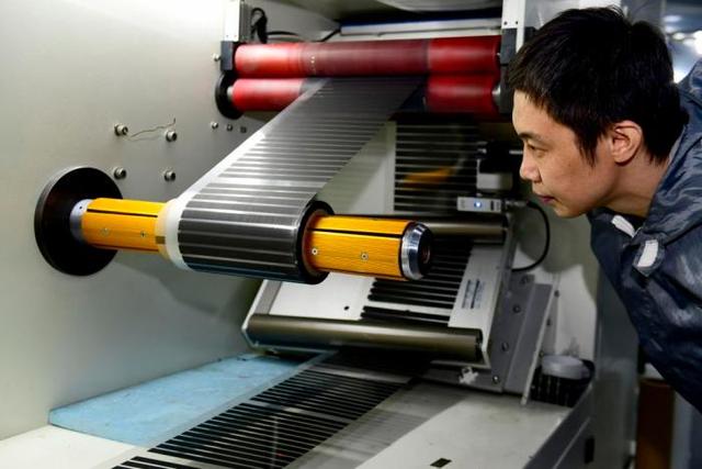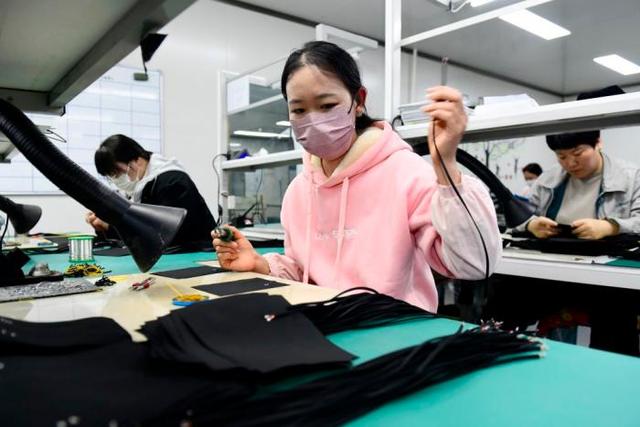 3月26日,在日照市五莲县一家企业,工作人员在加工纳米发热面料。