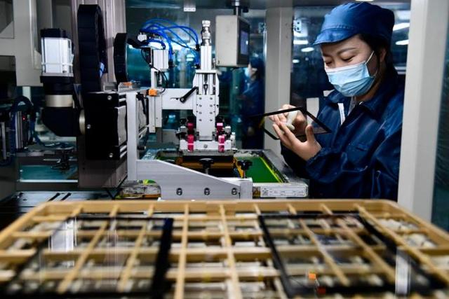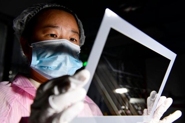 3月27日,在日照市莒县一家企业,工作人员在加工触摸屏。