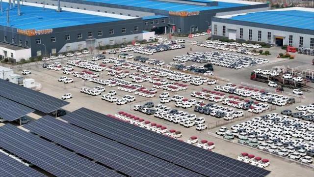 3月26日,在日照市五莲县一家企业,下线的新能源汽车停放在厂区广场(无人机照片)。
