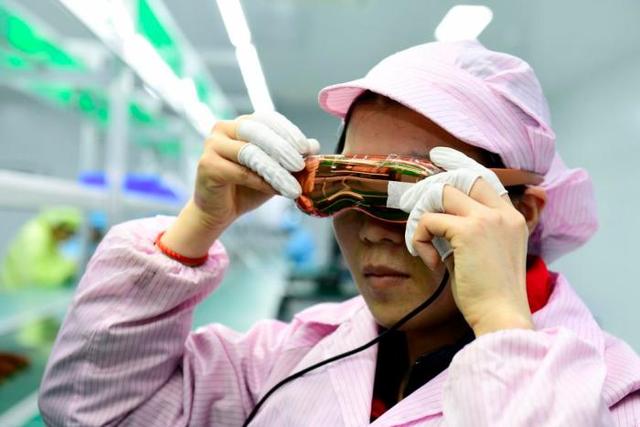 3月26日,在日照市五莲县一家企业,工作人员在调试VR眼镜。