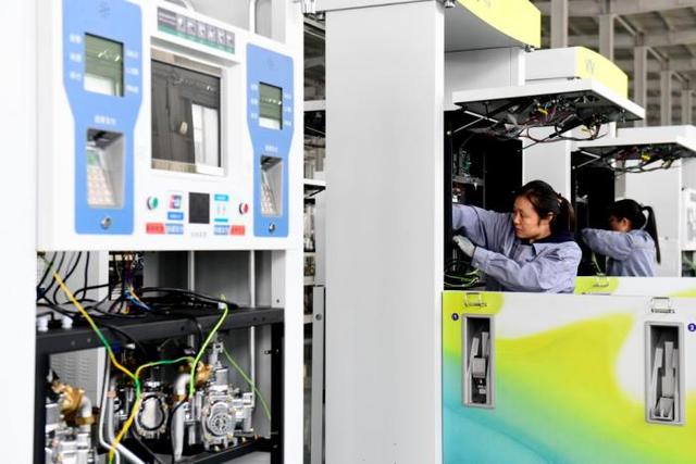 3月27日,在日照市莒县一家企业,工作人员在装配加油机。