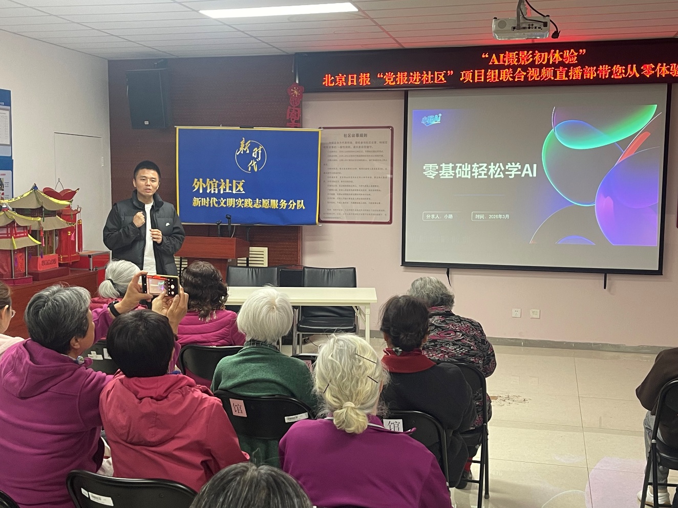 3月27日,北京日报 “党报进社区” 项目组携手视频直播部,走进安贞街道外馆社区,开展 “AI、摄影初体验” 公益课堂。本次活动专为零基础老年居民量身打造,全程用通俗直白的讲解、手把手的实操指导,教叔叔阿姨们最基础的AI使用方法和手机摄影技巧,打破老年人对智能工具的使用顾虑,让银发群体也能轻松玩转科技、记录生活。