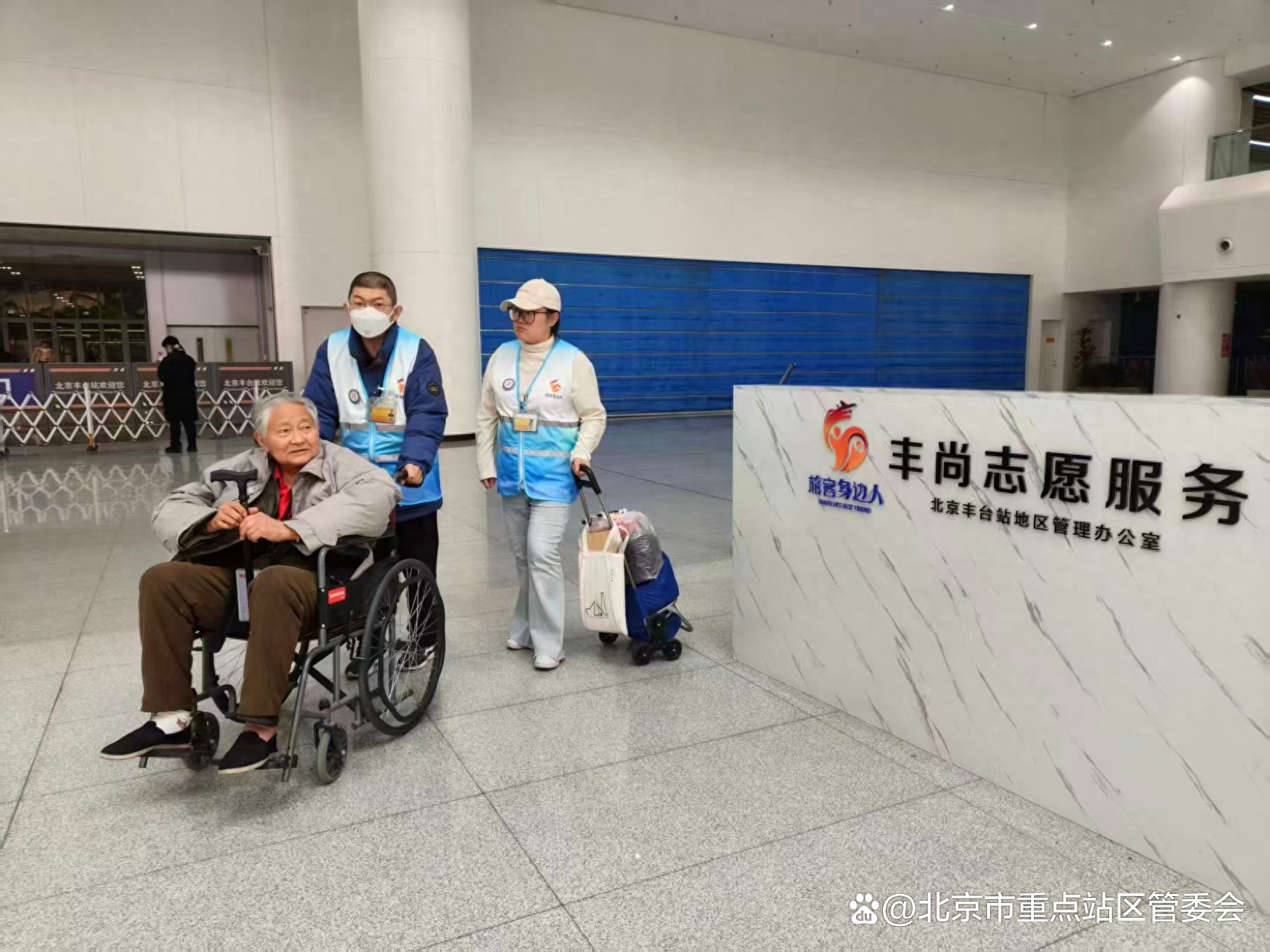 这名90多岁高龄的旅客因行动不便且与接站亲属沟通不畅,通过市12345热线求助,希望市重点站区管委会北京丰台站地区管理办公室协助与接站家属顺利会面。接到诉求后,丰台站办“旅客身边人”志愿者迅速响应,在地下南出站口找到了这位拄着拐杖、头发花白的老爷爷。