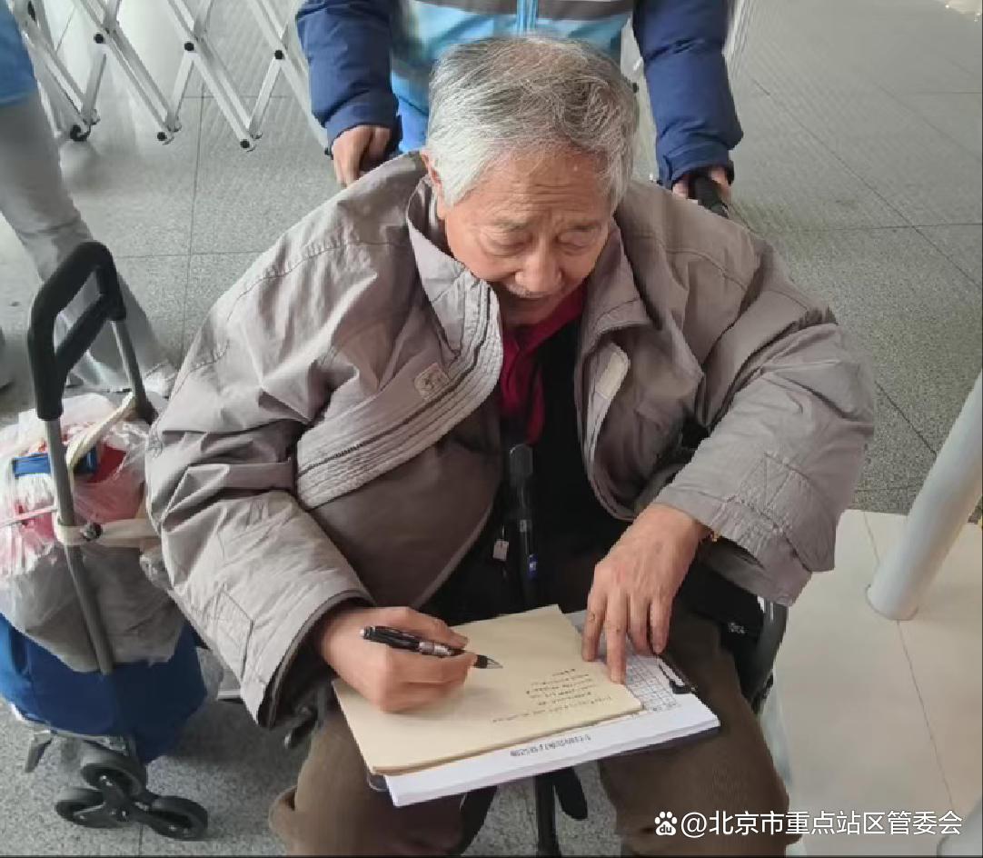 离别时,老人眼眶微红,亲笔写下感谢语:“丰台火车站重点站区志愿者们:感谢你们的关心和呵护,使我一个从上海来的老同志,由于你们的志愿帮助,摆脱帕金森病的行动不便,和站外来接的老人会面,再次感谢你们。”