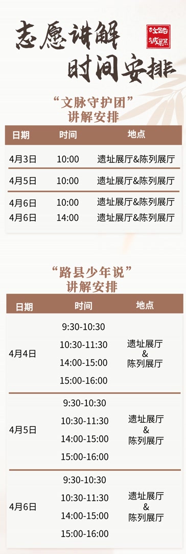 路县故城遗址公园致力于为市民游客朋友们打造沉浸式的历史文化体验,博物馆各展厅均设有讲解服务。除了每日4场公益讲解以及AI自助讲解之外,为了让大家更深入了解路县故城的历史,我们特别设立了志愿讲解服务(具体讲解安排详见下表)。