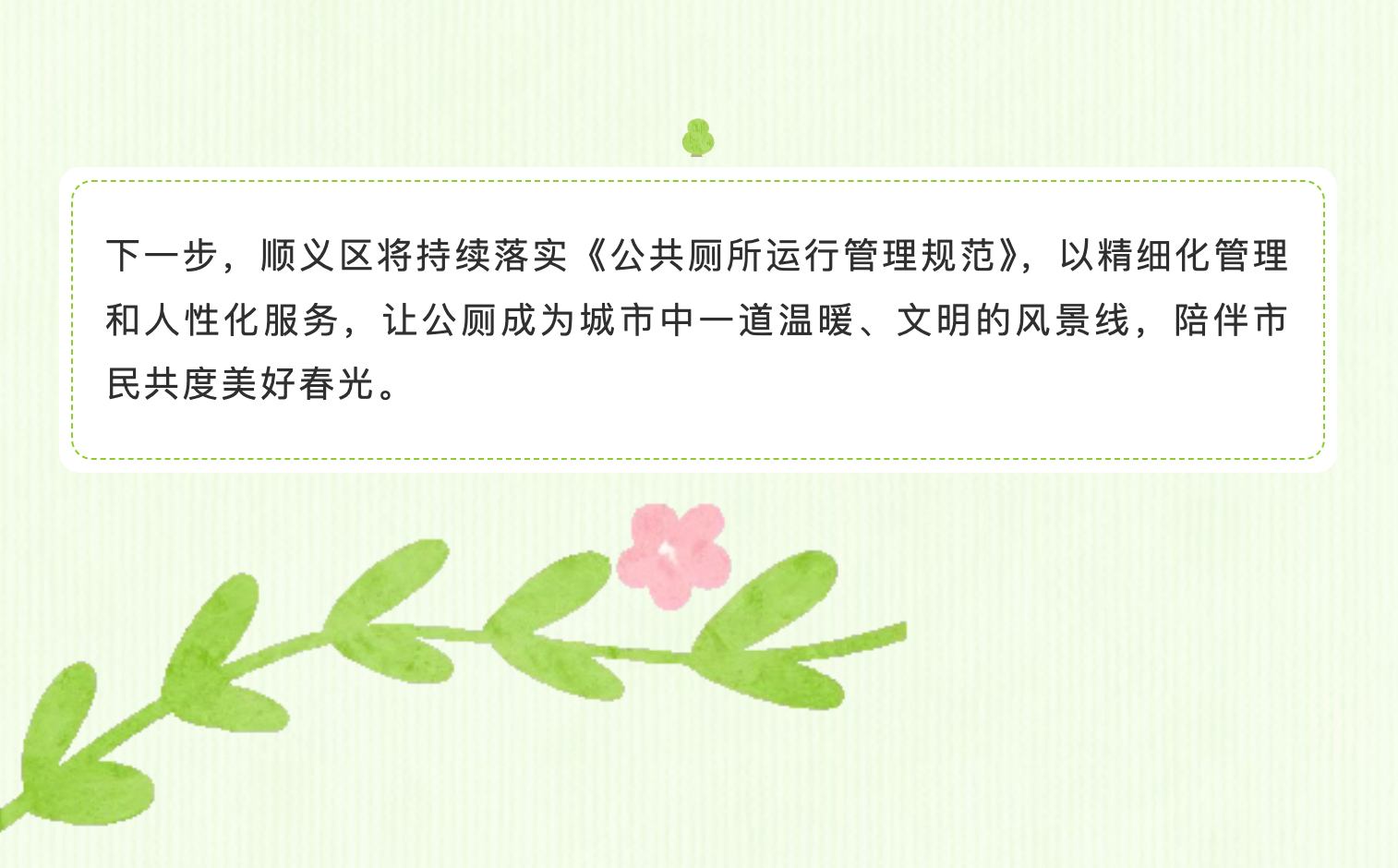 春回大地,万物焕新。顺义区城市管理委以“服务市民、精细管护”为理念,抓住春季环境提升的契机,全面开展城市公厕服务品质升级行动。通过三大重点措施,打造“洁净、清新、温馨”的公厕环境,为市民春日出行增添舒心体验(来源:北京市顺义区城市管理委员会)