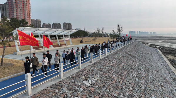 随着激昂的出征号令响起,在党旗、国旗、校旗的引领下,李恒强率队出发,拉练队伍迈着铿锵有力的步伐,沿长江路向银滩大拇指广场进发,开启15公里徒步征程。