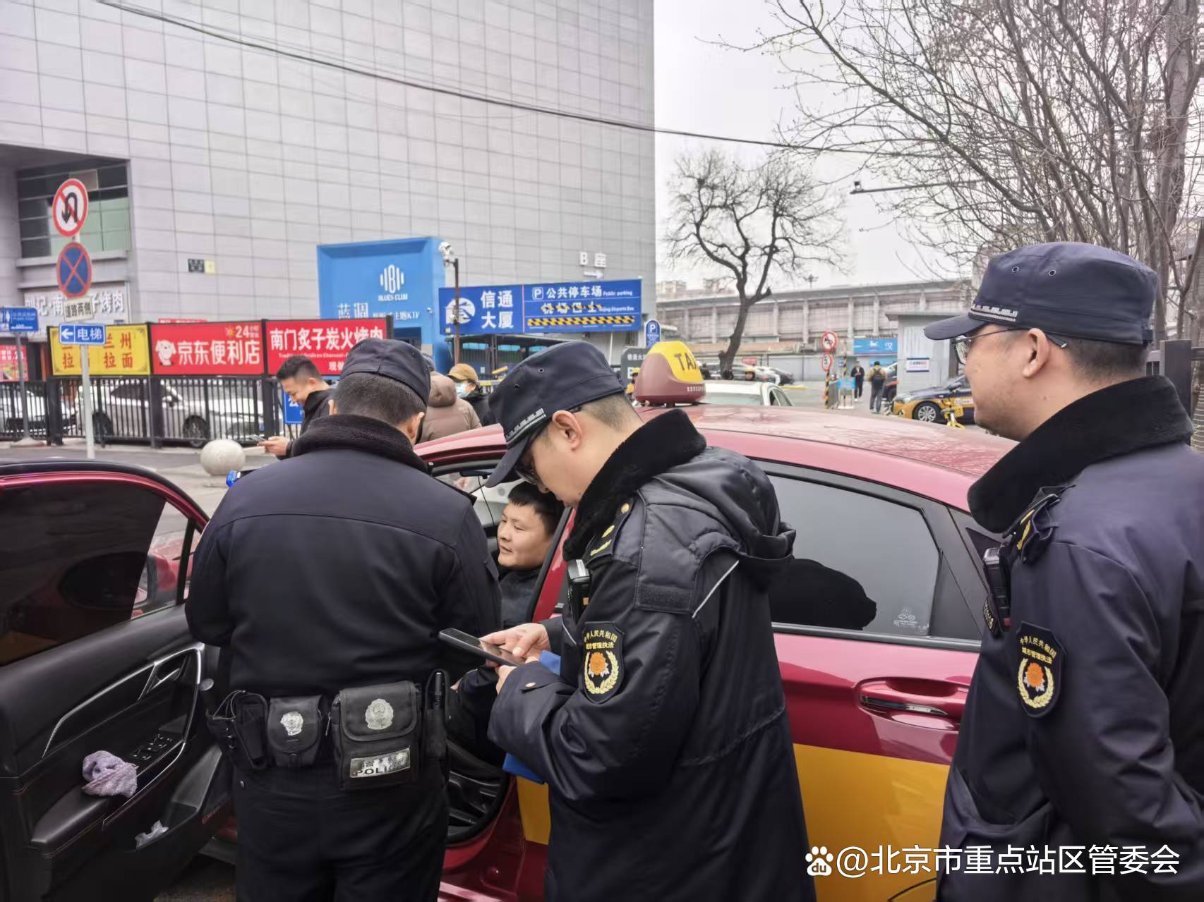 针对早晚高峰、节假日等客流密集时段,北京站地上地下停车场入口易出现人流、车辆聚集拥堵的问题,执法大队提前部署勤务,增派执法力量驻守现场,高效开展疏导分流工作。现场引导社会车辆有序驶入地下停车场,避免入口处车辆扎堆滞留;同时,加大对出租车运营行为的监管力度,及时制止、查处出租车私拉揽客、不按秩序运营等违规行为,规范营运车辆运营秩序,全力打通交通堵点,确保停车场周边道路平稳、畅通,让旅客出行更高效。