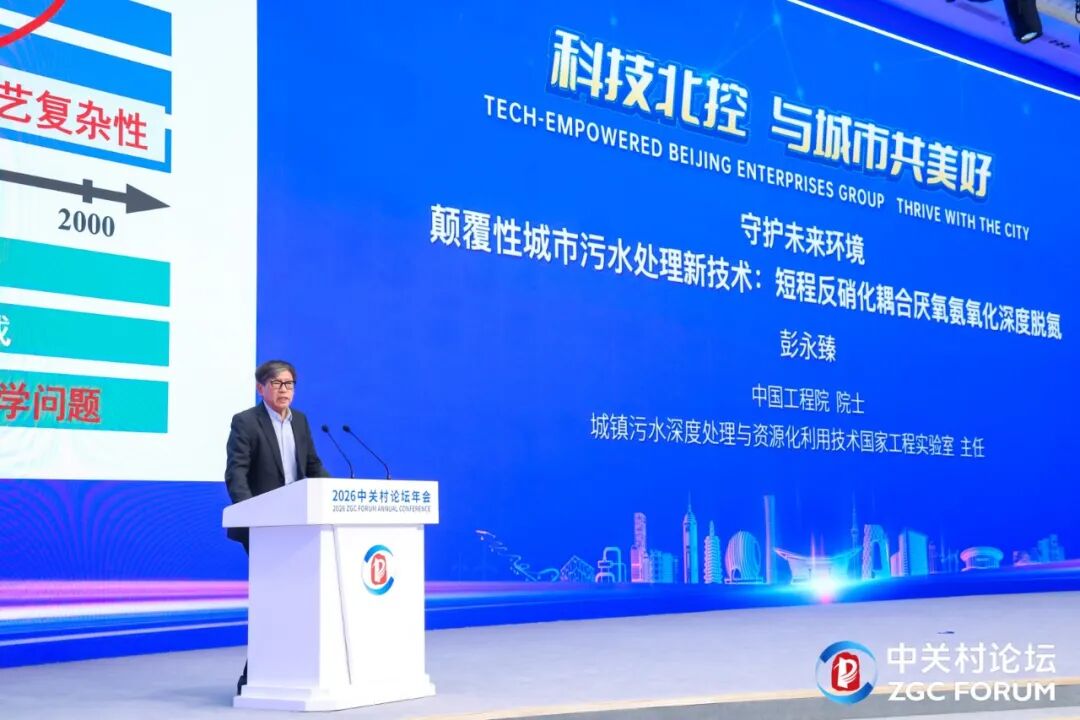 主旨演讲环节,中国工程院院士、北工大教授、城镇污水深度处理与资源化利用技术国家工程实验室主任彭永臻以“守护未来环境——颠覆性城市污水处理新技术:短程反硝化耦合厌氧氨氧化深度脱氮”为题,聚焦城市污水处理颠覆性技术,深入解读短程反硝化耦合厌氧氨氧化深度脱氮前沿成果。
