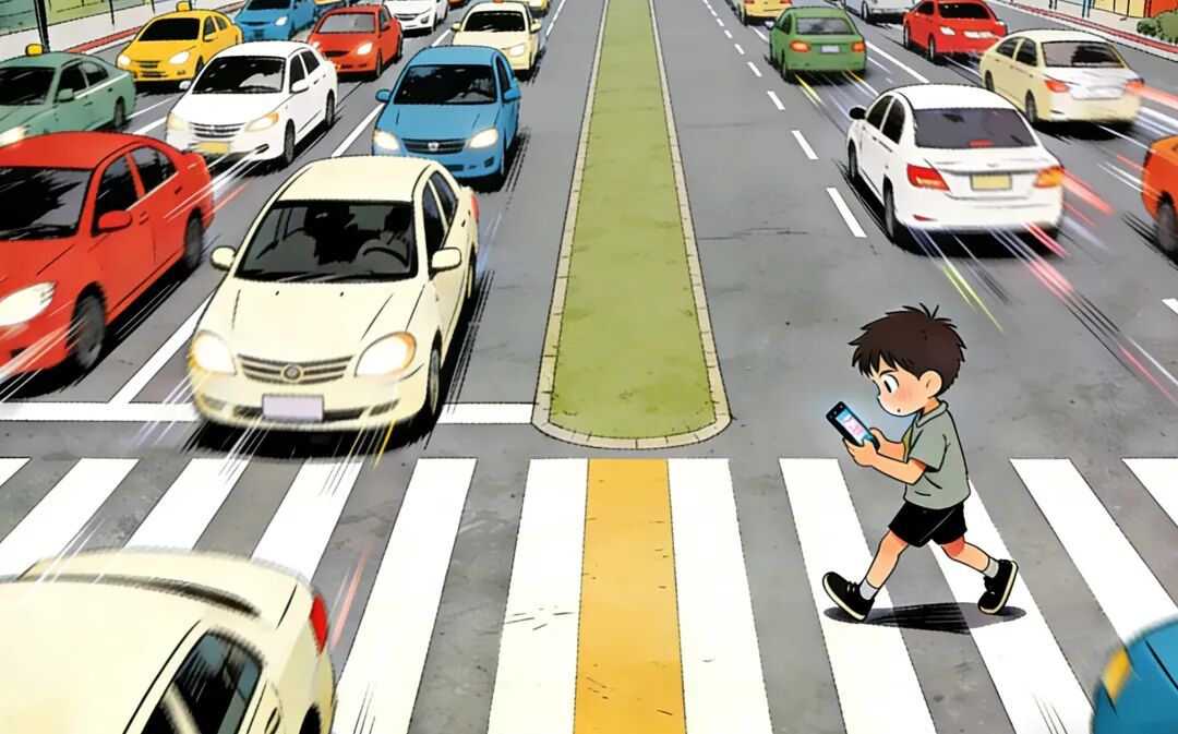 在此提醒同学们,过马路时务必牢记“一停二看三通过”,自觉收起手机,不嬉戏打闹,不低头分心。生命安全无小事,切勿因一时沉迷手机,将自身与他人安危置于险境。