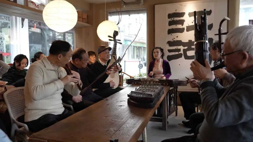 近日,上海市七宝老街蒲汇塘畔赏心院人文茶馆内,一场围桌雅集的江南丝竹春集温情奏响。本次活动由上海音乐学院中国仪式音乐研究中心主办,既是“拾回蚕丝的声音”项目的成果汇报,亦是学院派与民间丝竹传统交融碰撞、互学互鉴的和合共鸣。沪上长桥乐社、康文国乐团、范家班社等民间乐社与上海音乐学院(下称“上音”)师生齐聚一堂,共赴这场跨越时空的传统之约。