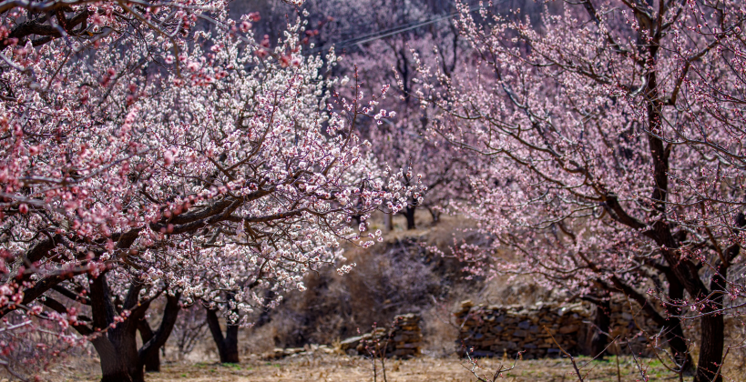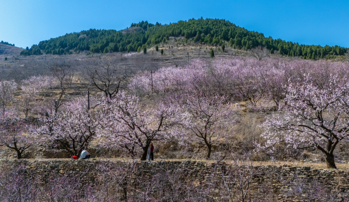 春日的章丘石匣村,漫山杏花次第绽放,粉白花瓣缀满枝头,微风拂过簌簌飘落,与青石古村相映成趣。
