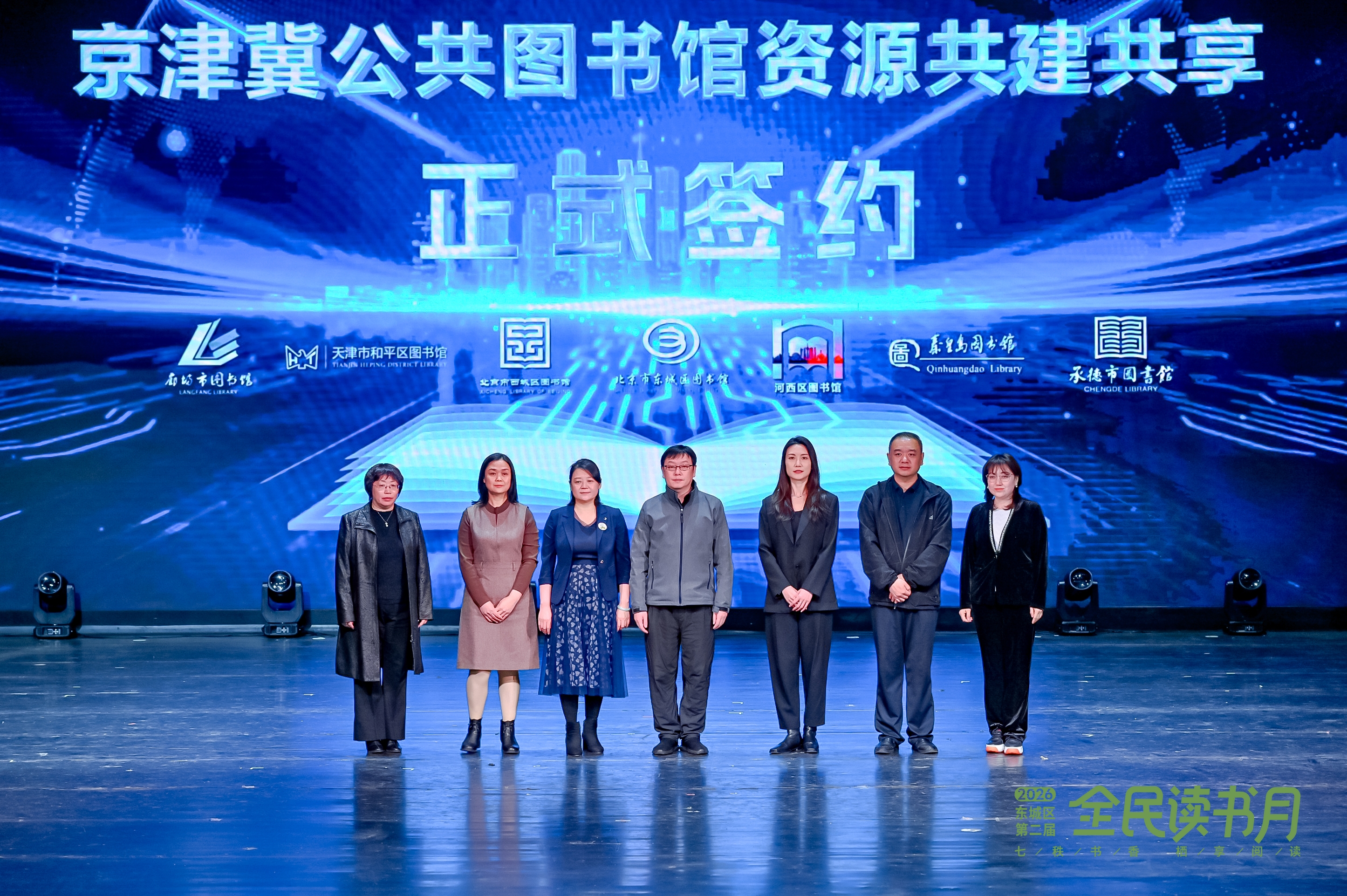 全民阅读,书香聚友,盛会如约,新篇同启。活动的重头戏是“京津冀公共图书馆资源共建共享签约仪式”。东城区图书馆与北京西城区图书馆,天津和平区图书馆、河西区图书馆,河北廊坊市图书馆、承德市图书馆、秦皇岛图书馆等七家单位现场签约。这一举措旨在积极响应《全民阅读促进条例》,打破行政壁垒,推动文献资源互通有无、服务协同高效、平台共建共享,着力构建互联互通、普惠便捷的京津冀阅读生态圈,为全民阅读高质量发展注入区域协同新动能。