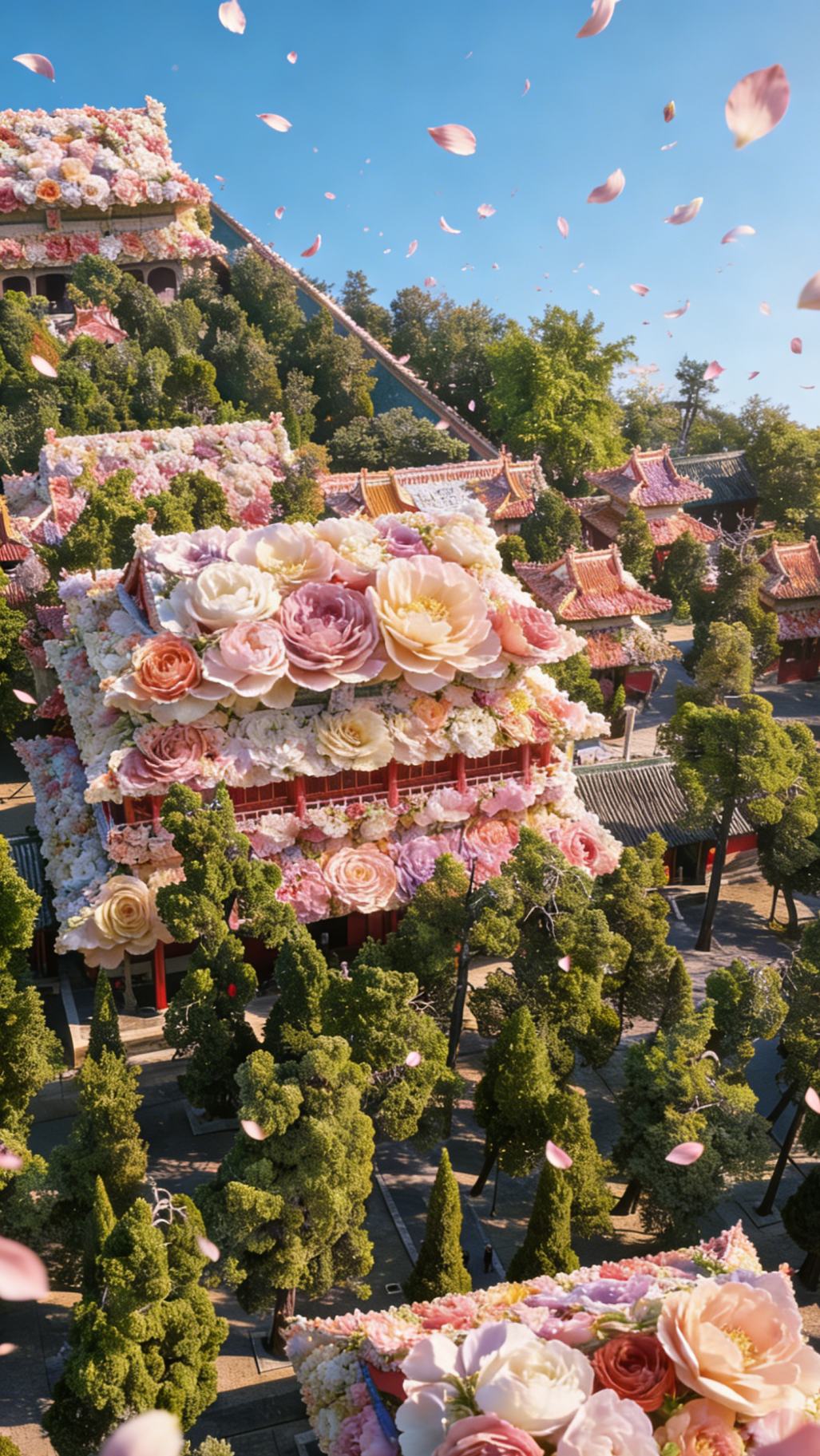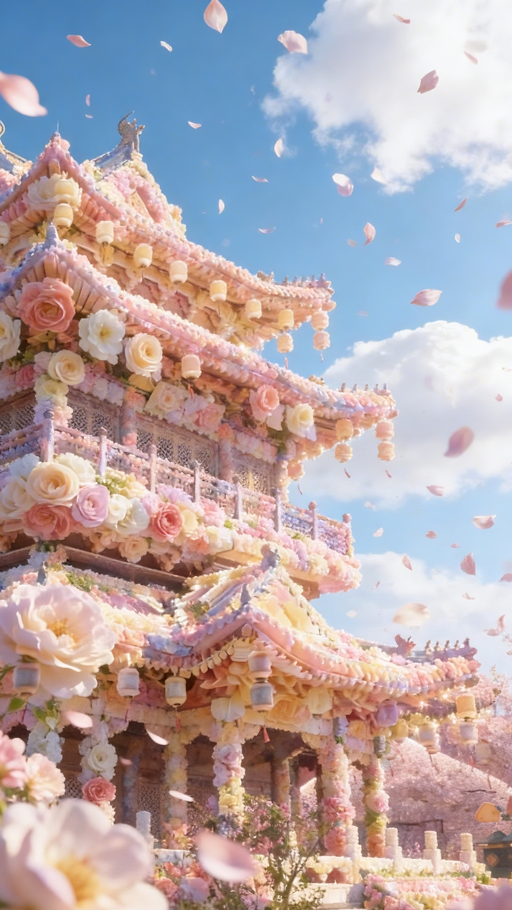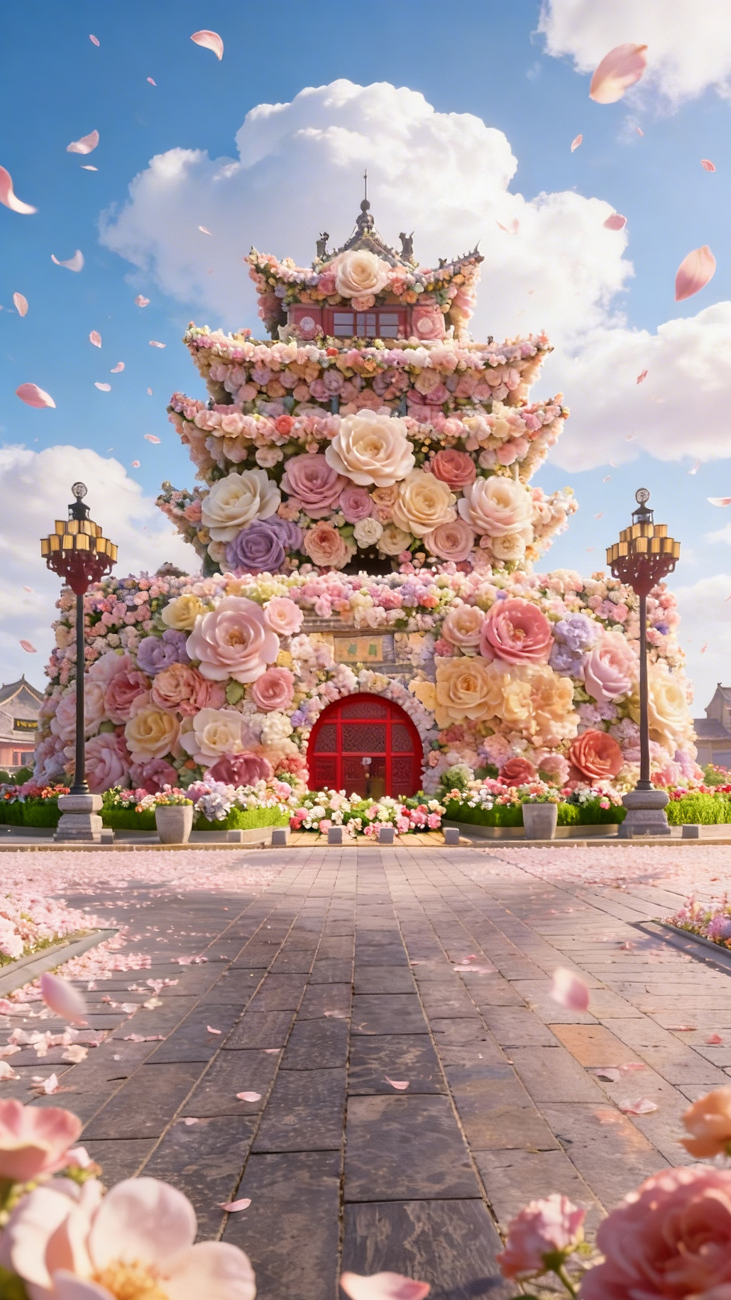 亭台楼榭被花朵温柔包围,