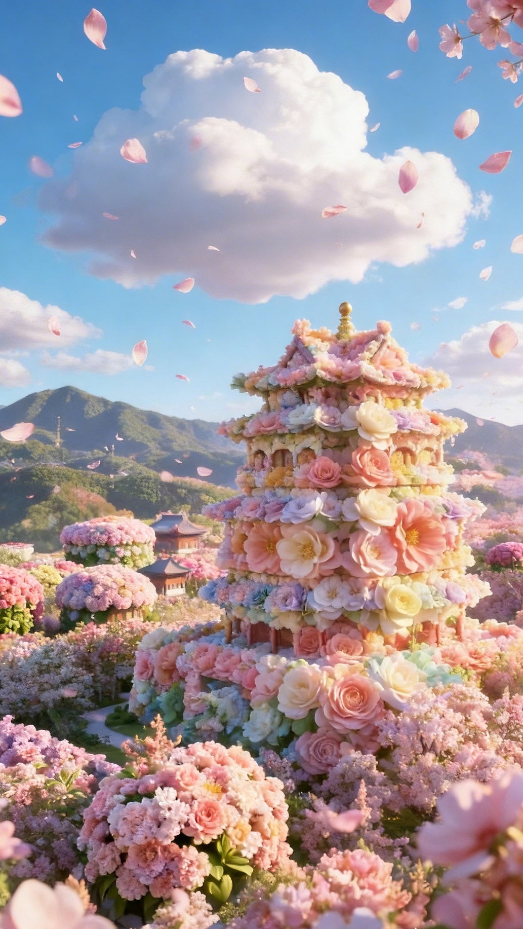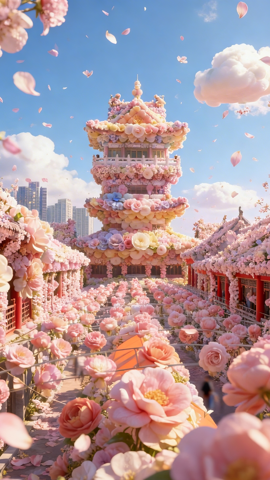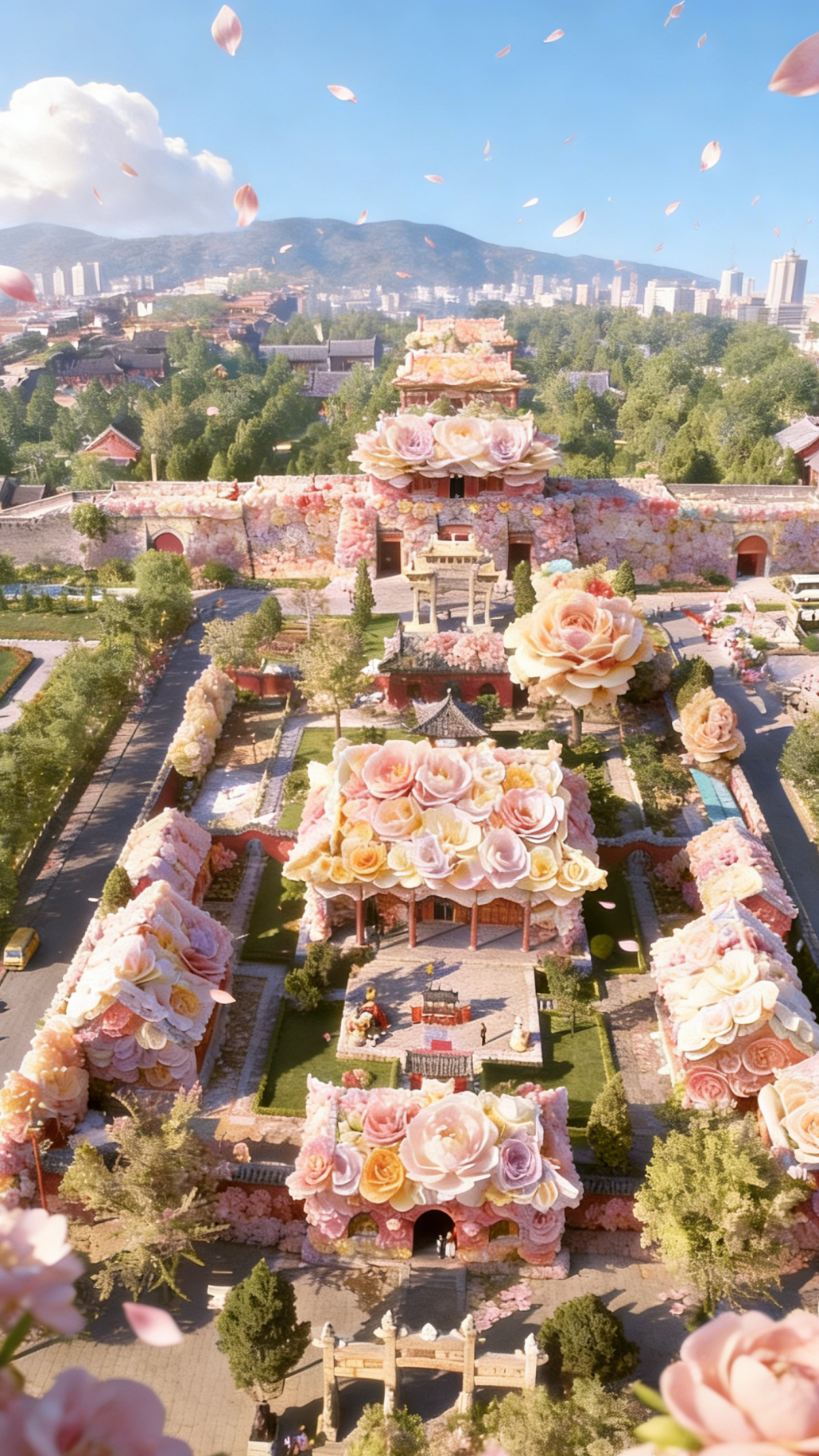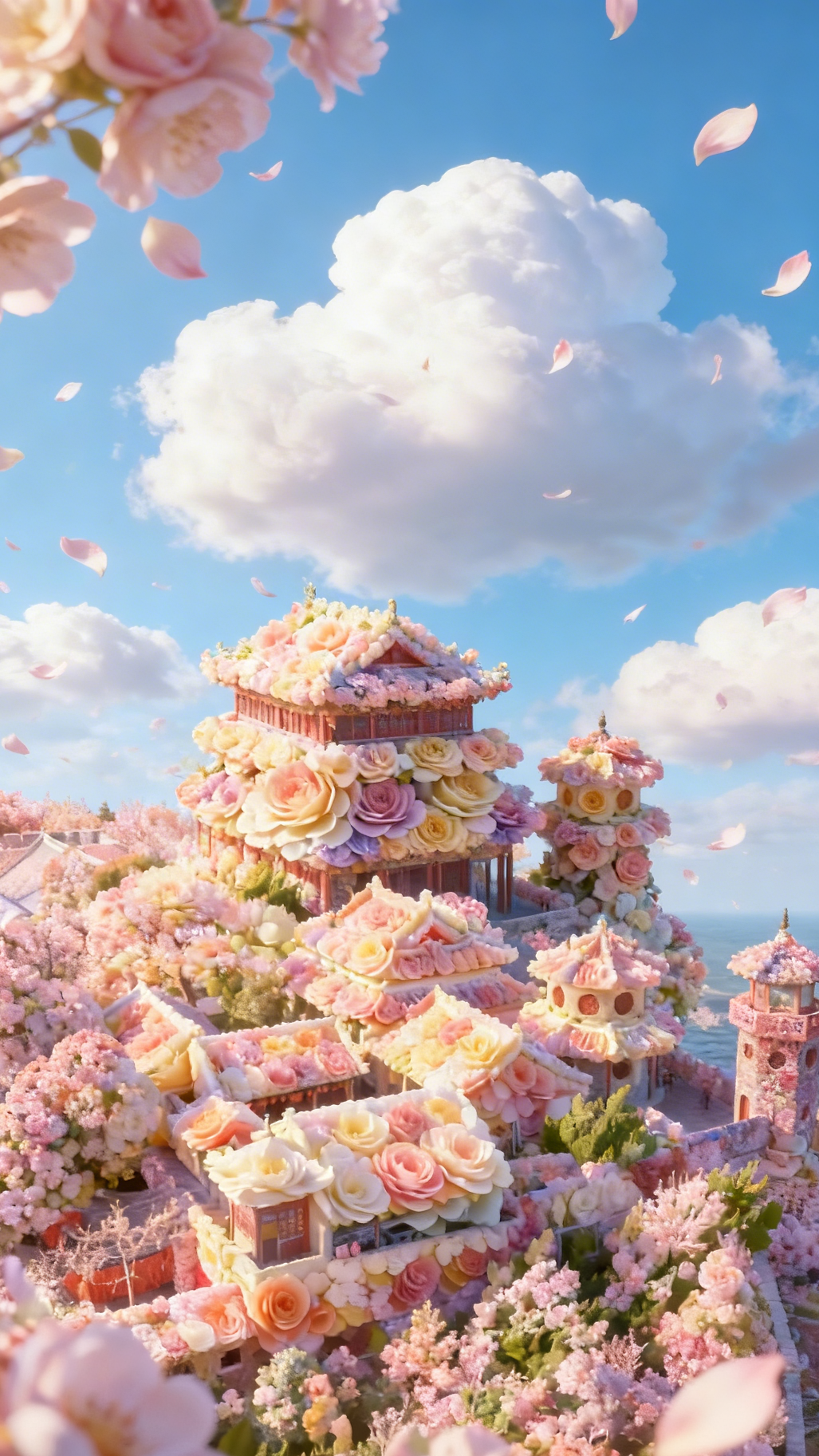 亭台楼榭被花朵温柔包围,