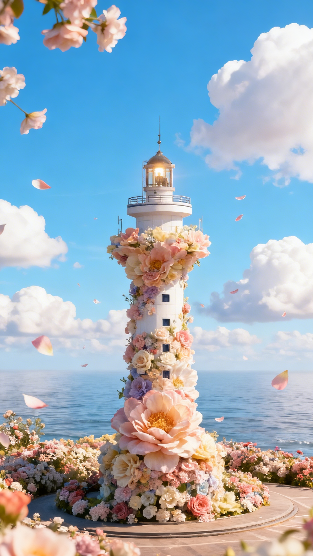 灯塔在花海中守望。