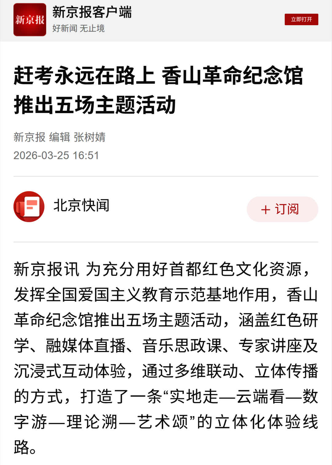 香山革命纪念馆精心策划推出“赶考永远在路上”主题系列活动,包含红色研学、融媒体直播、音乐思政课、专家讲座及沉浸式互动体验。