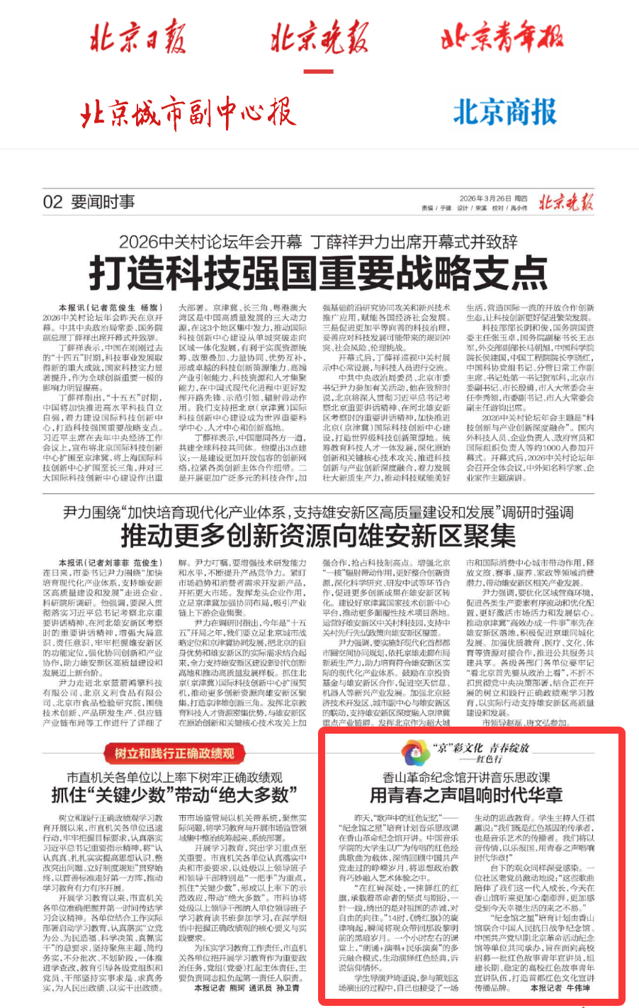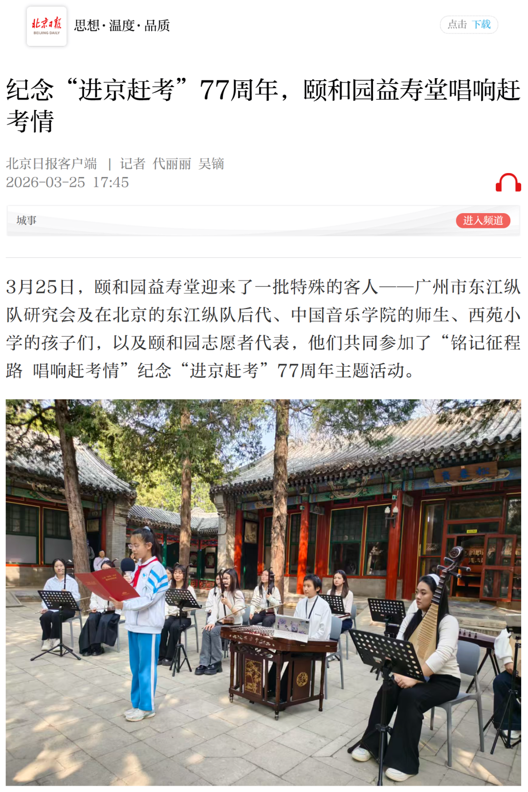 3月25日下午,香山革命纪念馆联合共青团中国音乐学院委员会、海淀区香山街道办事处举办“歌声中的红色记忆”——“纪念馆之星”培育计划音乐思政课,以“朗诵+演唱+民乐演奏”模式,重温中国共产党的光辉历程。