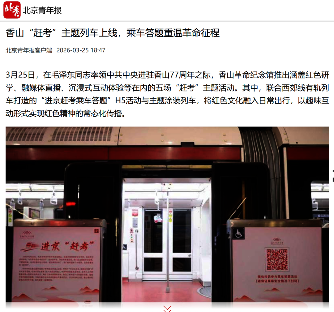 香山革命纪念馆联合西郊线有轨电车推出赶考主题列车,并上线“进京赶考乘车答题”H5活动,乘客在候车、乘车途中可扫码参与答题挑战。