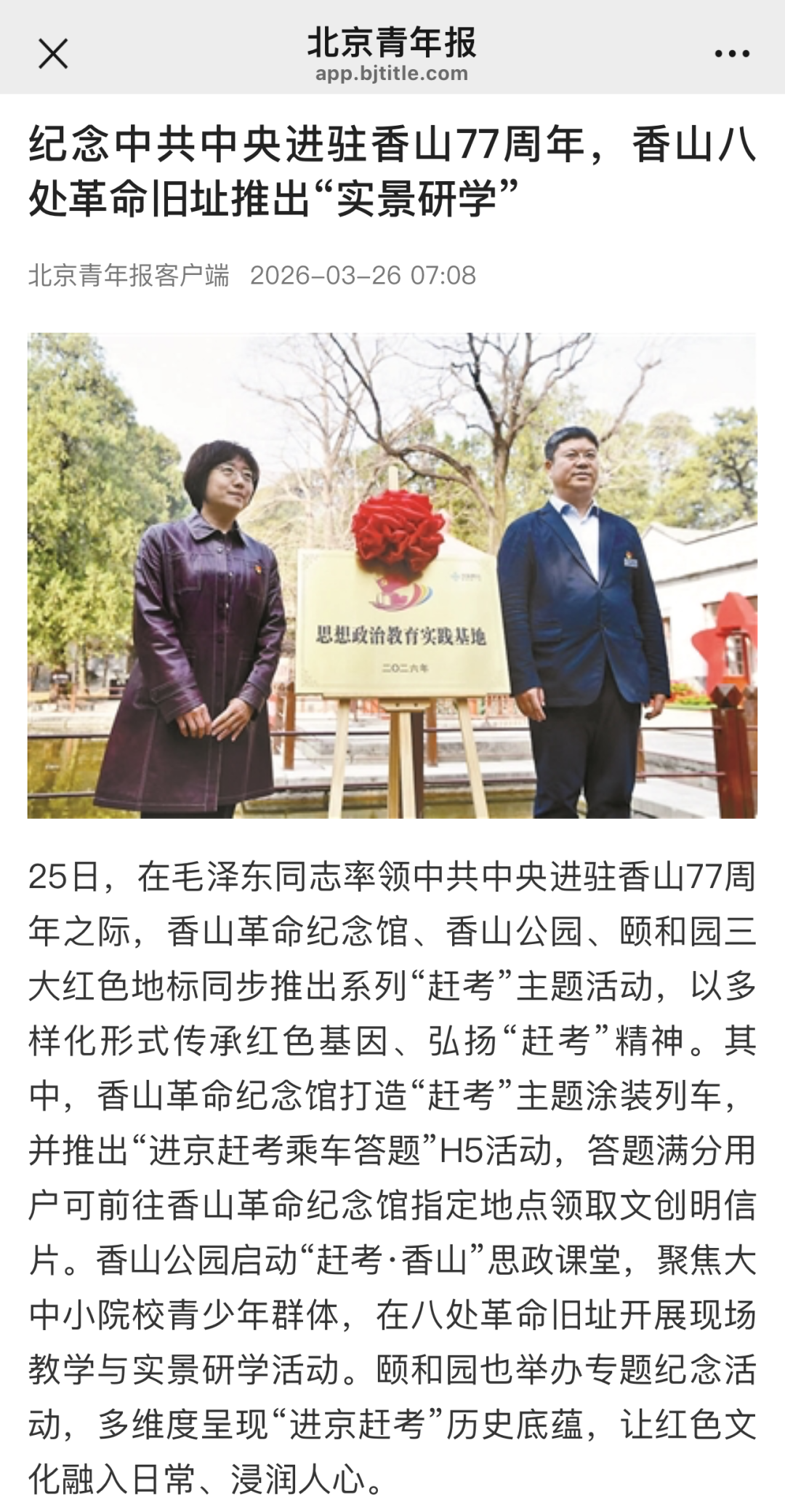 3月25日,北京市香山公园管理处干部职工、共建单位代表、学生代表沿着1949年中共中央进京赶考路线,从东门广场步行至双清别墅。