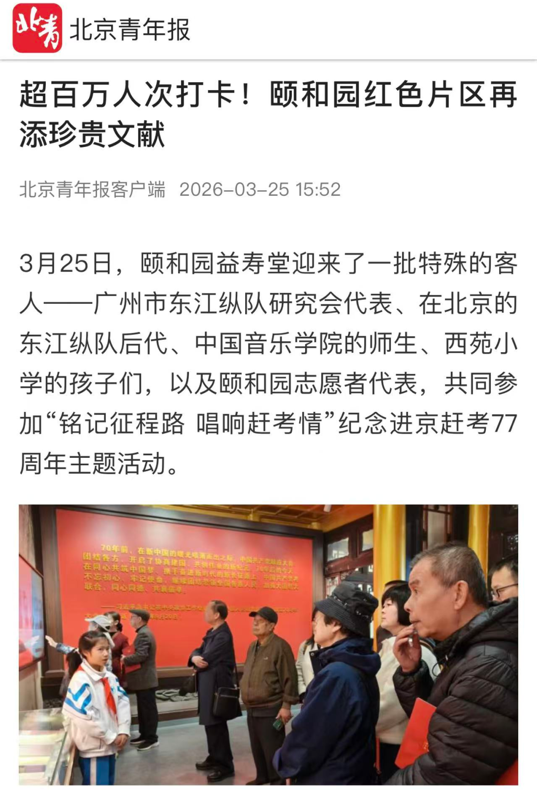 3月25日,颐和园益寿堂举办“铭记征程路 唱响赶考情”主题活动。广州市东江纵队研究会向颐和园管理处捐赠珍贵红色文献《粤港澳敌后抗战回忆录》,全体人员参观“古都春晓——中共中央‘进京赶考之路’颐和园专题展览”,重温进京赶考的光辉历程。