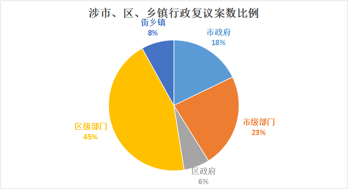 在层级分布上,与去年相比,区级行政复议机关(包括北京经济技术开发区管理委员会)收案增长较快,收案占比达51%;市政府和市司法局作为市级行政复议机关,收案占比为49%。从被申请人角度看,被申请人为市级行政机关(含市政府)的行政复议申请为28587件,占比41%;被申请人为区级行政机关(含区政府)的有35196件,占比51%;被申请人为街道、乡镇行政机关的有5312件,占比8%。