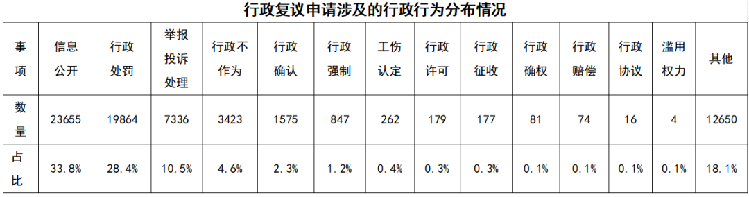 从行政复议申请事项涉及的行政行为来看,政府信息公开、行政处罚、投诉举报、行政不作为占主要部分,分别为23655件、19864件、7336件、3243件,占比34%、28%、11%和5%。其他,如行政确认、行政许可、行政征收、行政协议等行政复议案件,尽管占比较小但增速较快。