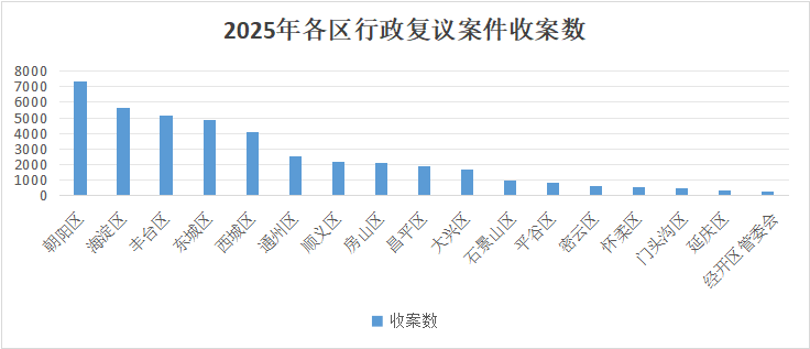 从地域分布看,各区行政复议案件分布不平衡。朝阳、海淀、丰台、东城、西城5个区行政复议案件数均在4000件以上,分别为7383件、5656件、5118件、4843件和4106件。