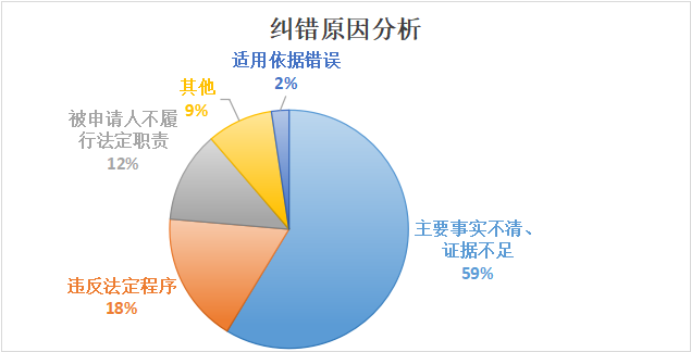在直接纠错案件中,因行政行为主要事实不清、证据不足被纠错的案件最多,占全部纠错案件的59%。此外,因违反法定程序被纠错的占18%,因被申请人不履行法定职责被纠错的占12%,因适用依据错误被纠错的占2%,另有因超越职权或滥用职权、行政行为明显不当等原因被纠错的占比9%。