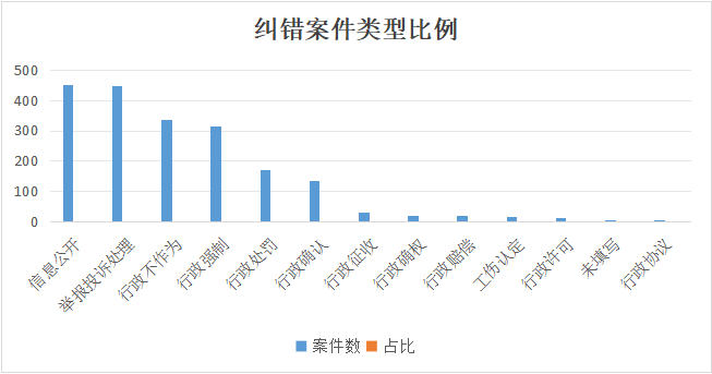 从直接纠错案件涉及的行政行为来看,占比较高的是信息公开、举报投诉处理、行政不作为、行政强制、行政处罚,分别为15.64%、15.6%、11.71%、10.98%和5.98%。