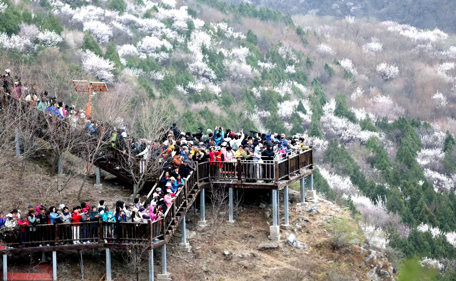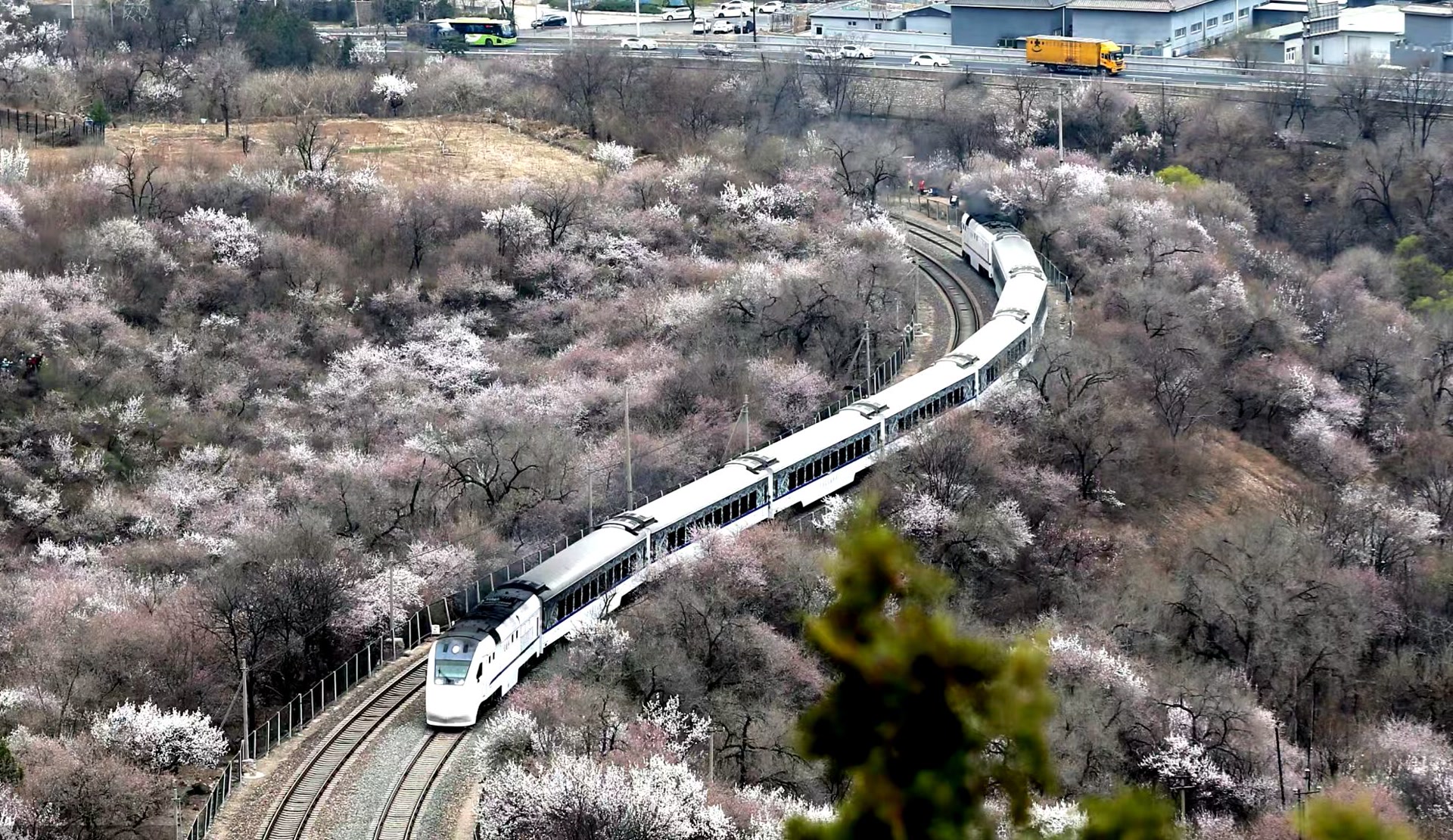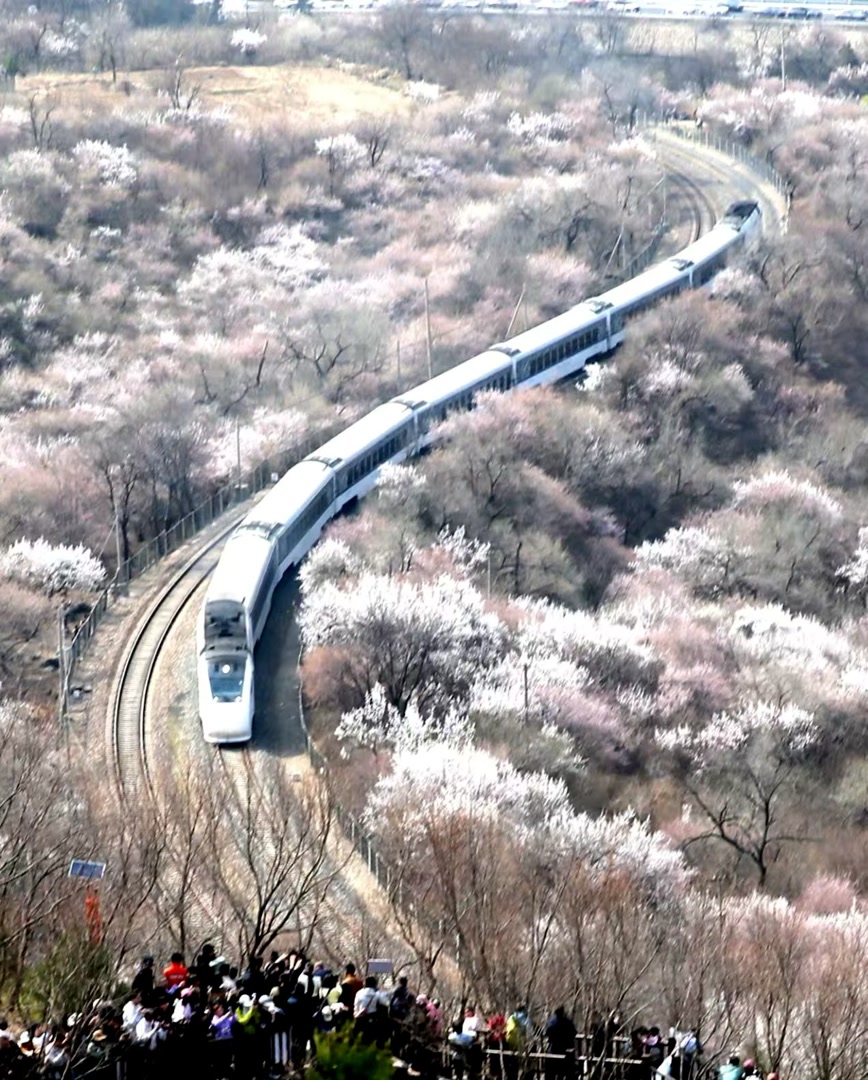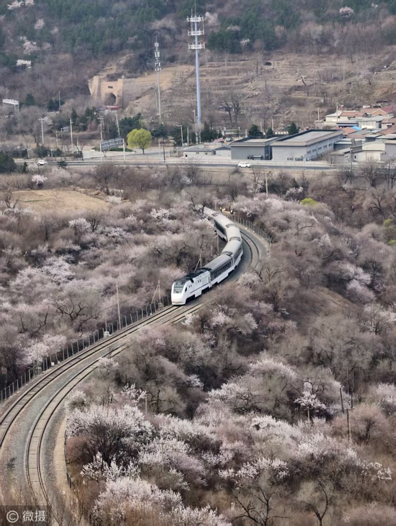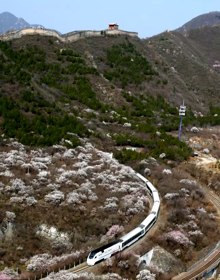 2026年3月29日,北京市郊铁路S2线列车在居庸关长城脚下的花海中畅游,美如画卷,吸引了众多游客前来观赏。3月下旬至4月中旬,北京市郊铁路S2线沿途迎来山花盛放的高峰期。列车穿行于粉白交织的花海与巍峨长城之间,宛如驶入漫画世界,成为京津冀地区的“明星”春日打卡点。