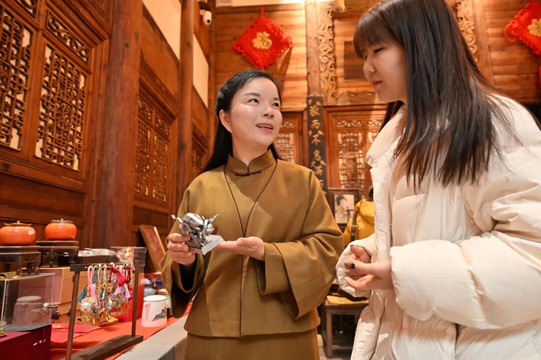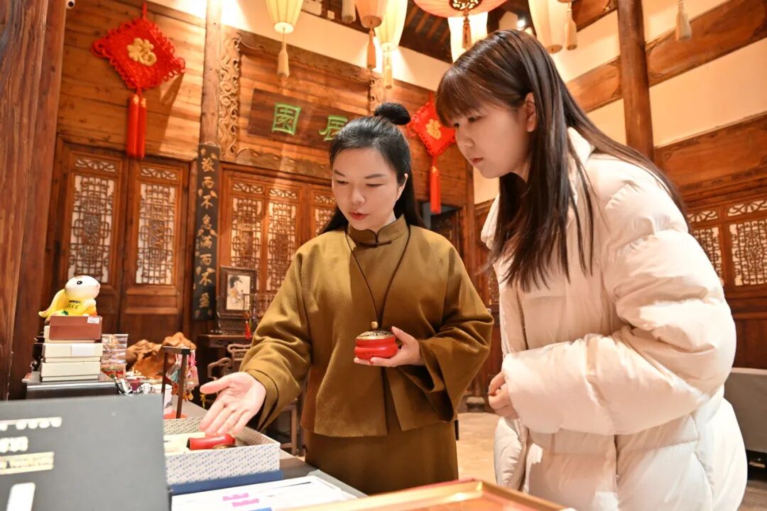 在她的办公桌上,没有堆积如山的文件,一杯温热的春茶,一台打开着AI创作工具和活动策划文档的电脑,还有几样非遗手作样品——拓印模板、宋锦葫芦、花丝镶嵌小饰件,简洁却处处透着忙碌。“这些都是春天会非遗体验区的样品,我得提前把关,确保现场的体验道具质量。”她拿起一个宋锦葫芦,指尖摩挲着精致的纹路,“就像三月的三八节活动,我们选的中药养生锤是外交部女外交官体验的同款,宋锦配饰结合了马年的美好寓意,大家参与的热情特别高,这也让我更确定,传统文化只要贴近生活,就会有无限活力。”