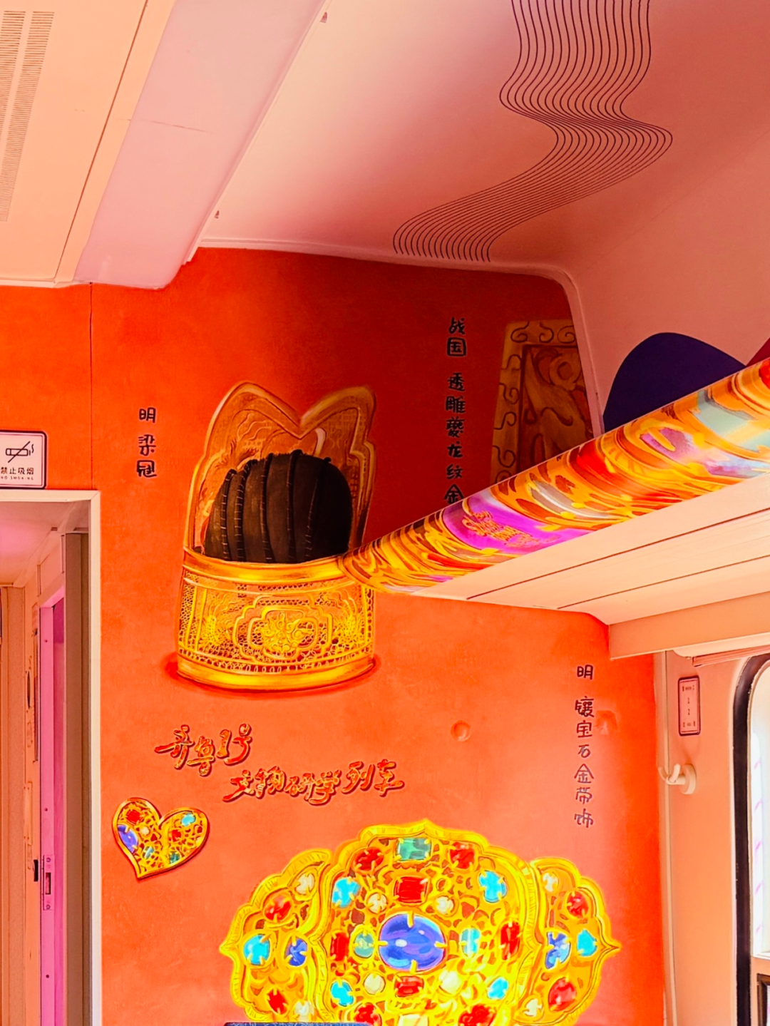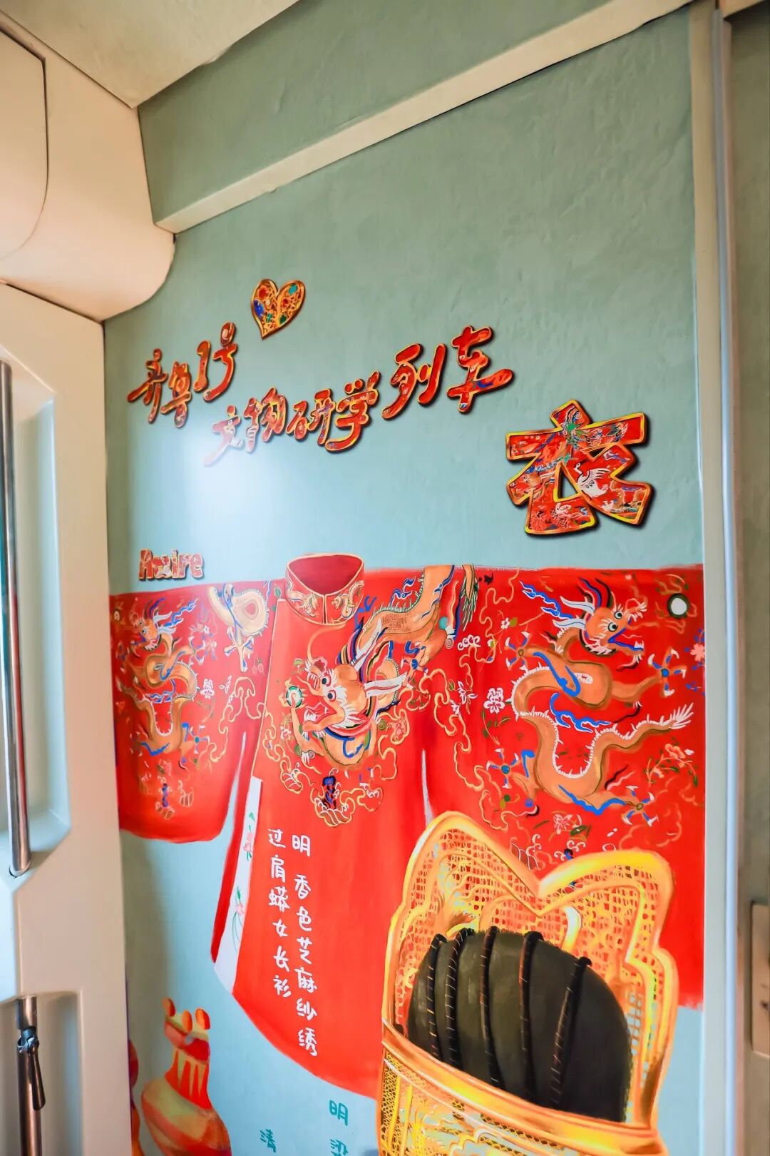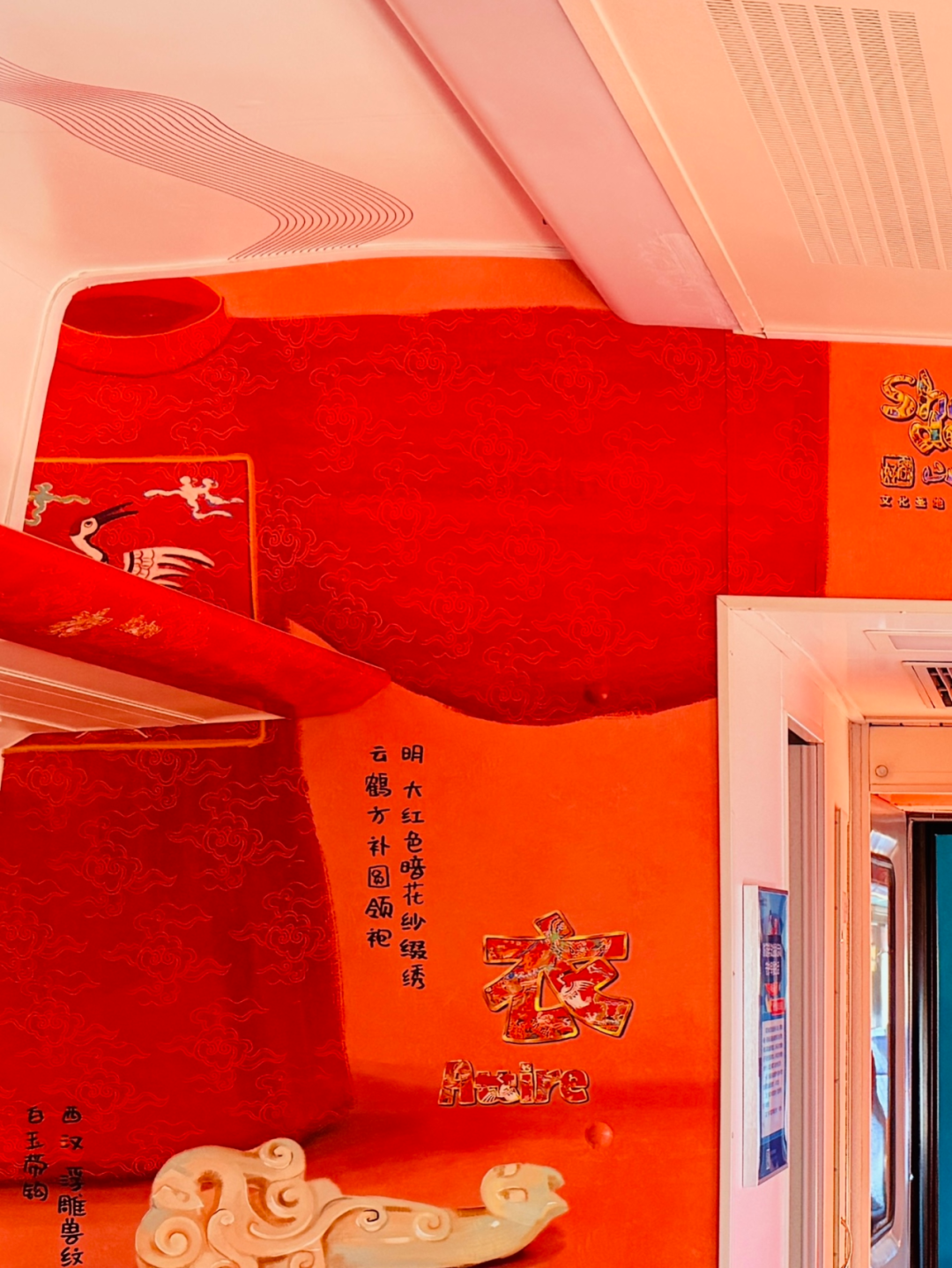 硬座车厢之一的主题为服饰。步入车厢,仿佛走进了一座流动的古代衣冠博物馆,看见件件华服冠饰的精致璀璨,也窥见背后的礼仪文明。