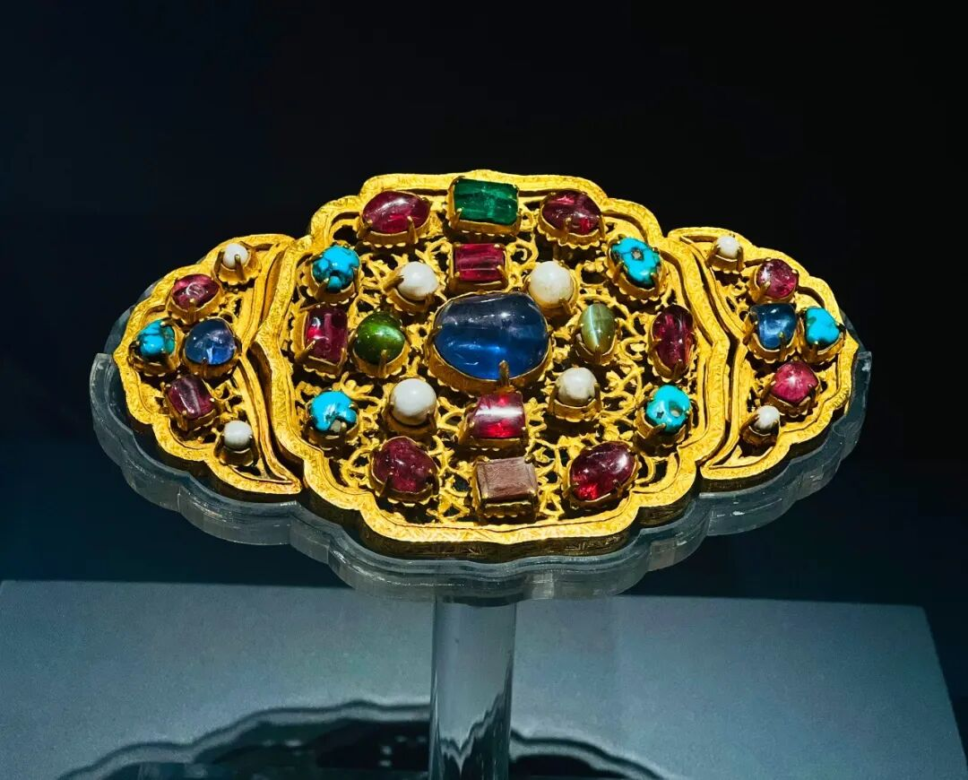 山东博物馆藏镶宝石金带饰以金质托体,镶嵌众多宝石,整体呈如意云头状,中间主件为如意形,两侧活件为云头形,边缘錾刻线纹。