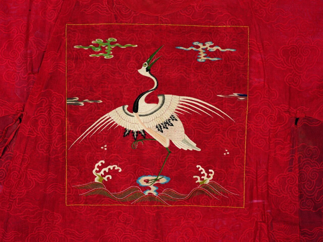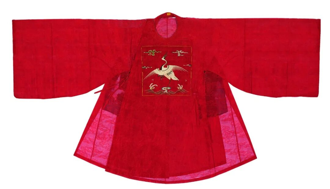 大红色暗花纱缀绣云鹤方补圆领袍是明代男性圆领袍衣的一种,此件织物为暗花纱,图案是明代广泛流行的四合如意云纹。衣身前胸、后背处各绣云鹤纹方补。