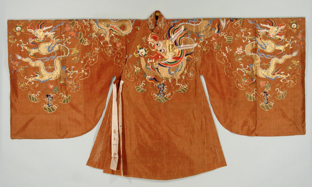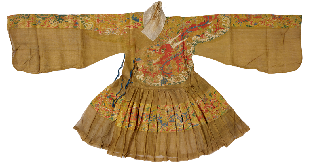 香色芝麻纱过肩蟒女长衫属于孔府旧藏,整件衣服采用的是圆领上缀竖领,大襟右衽,是十分典型的明代服饰样式。
