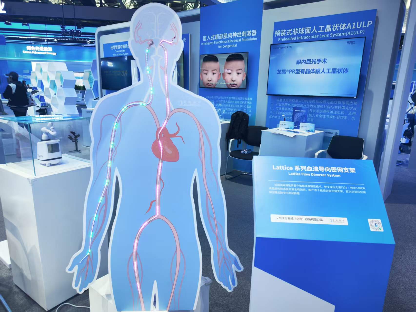 展台中央,一个30厘米长、通体银白的流水线型网状模型引得不少观展人驻足。工作人员向记者指出,这是Lattice血流导向密网支架放大300倍后的样子,它的真身直径仅有2到5毫米。“这个支架的网眼特别密,就像一个精准的‘筛子’,能把冲进动脉瘤的血流挡回去,同时给正常血流留出畅通的通道。时间一长,没有了血流冲击,动脉瘤就会慢慢萎缩闭合,再也没有破裂的风险。”展台工作人员介绍。