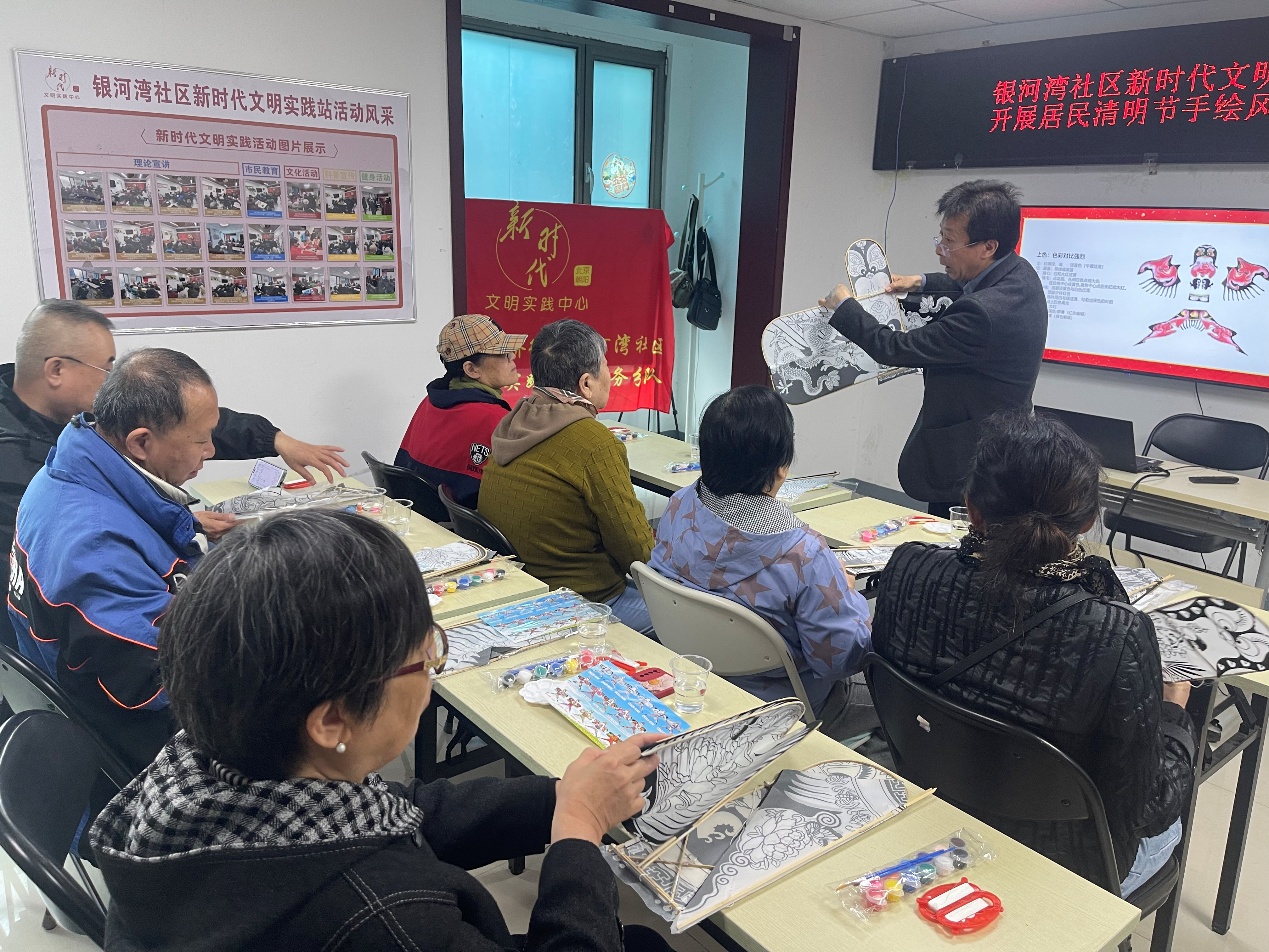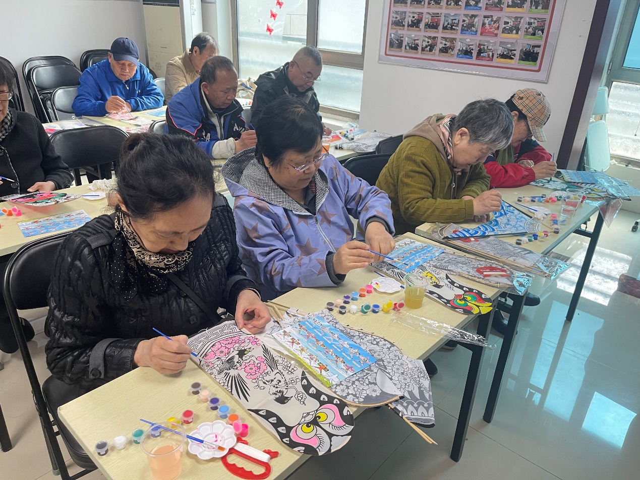 随后,老师详细拆解了传统风筝的上色技巧,重点讲解 “色彩对比强烈” 的核心上色原则,包括白 、黄、红的过渡技法、点花晕染方法、不同色彩的搭配要点,从基础的颜料使用到细节的晕染技巧,都做了细致入微的讲解,让居民们全面掌握传统风筝的制作工艺。