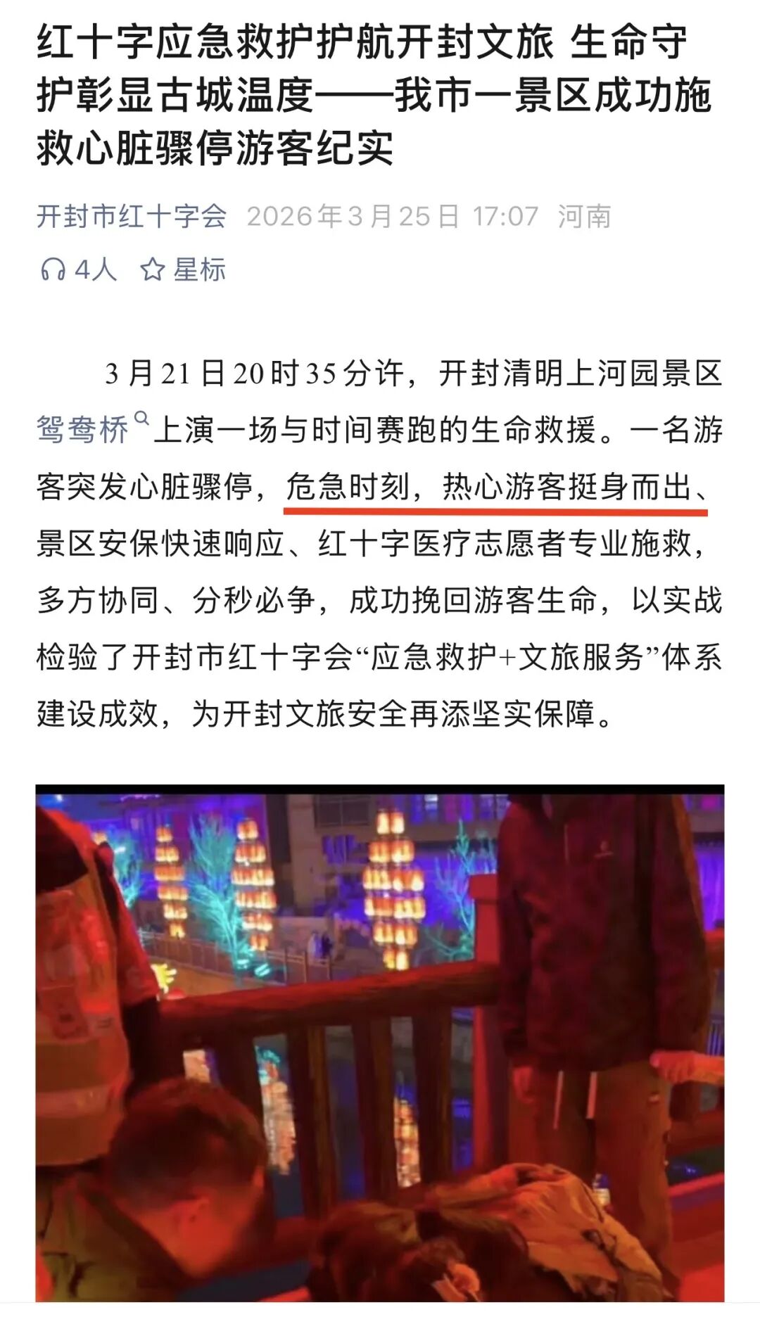 3月21日晚,河南开封清明上河园景区内,一名28岁男性游客突然倒地,双眼上凝、口唇紫绀,生命危在旦夕。