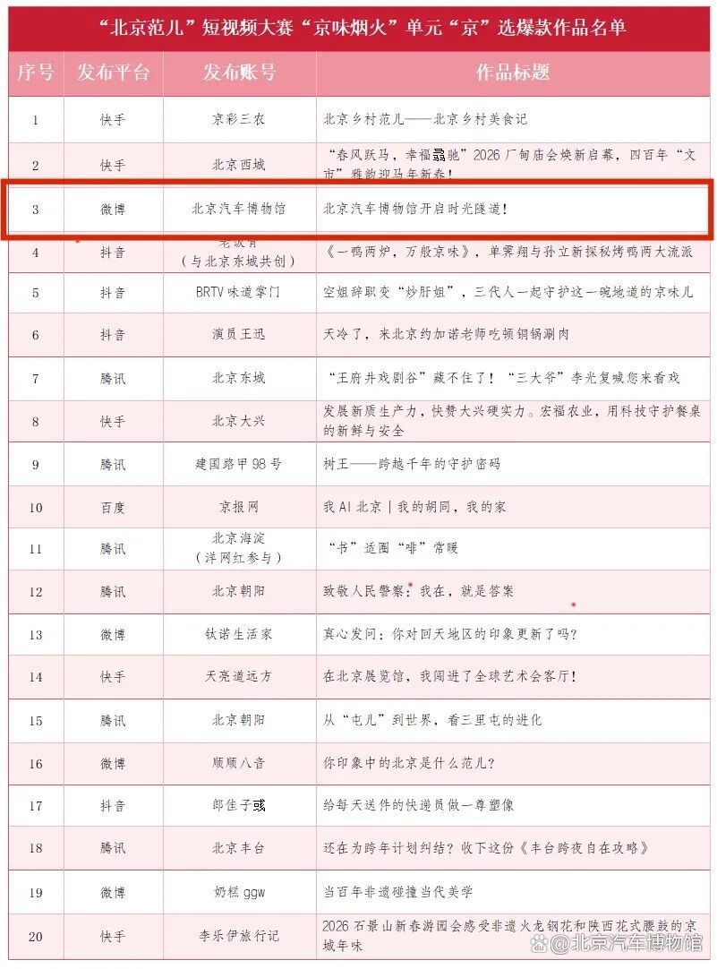 近日,由北京市委宣传部、市委网信办、市广电局、抖音、快手等单位联合主办的“北京范儿”短视频大赛第三季“京味烟火”单元获奖作品名单揭晓。北京汽车博物馆选送的说唱宣传片《北京汽车博物馆开启时光隧道!》从众多参赛作品中脱颖而出,荣获“北京范儿”短视频大赛“京味烟火”单元“京”选爆款奖项。