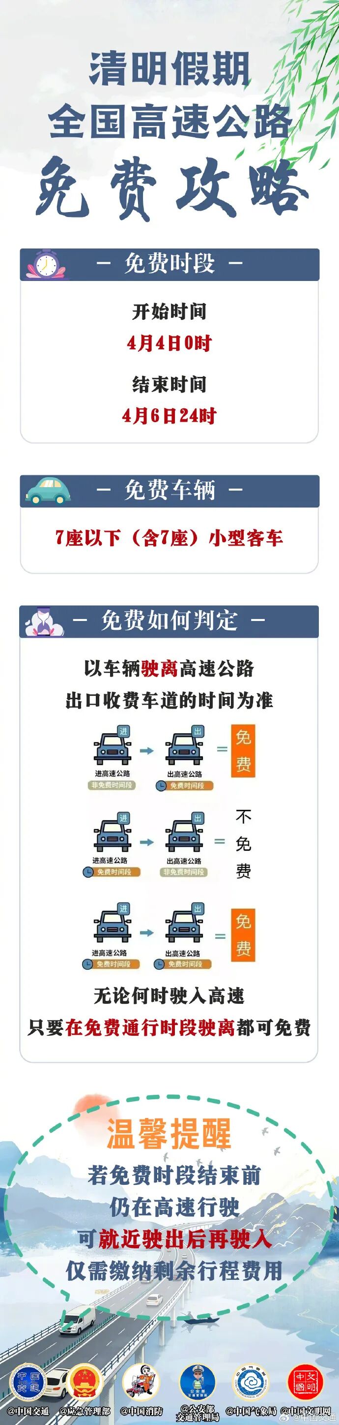 记者31日从交通运输部获悉:2026年清明节假期,7座以下(含7座)小型客车上高速公路继续免收通行费,免费通行时间为4月4日0时至4月6日24时,共计3天。