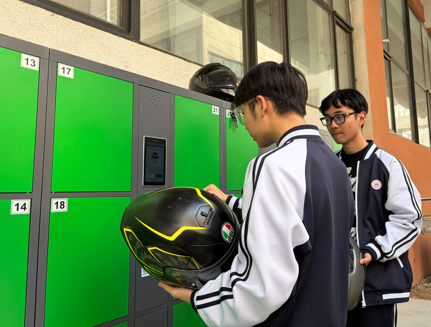 为让“头盔就是保命盔”理念入脑入心,学校多措并举强化宣传引导。在国旗下讲话、主题班会中,学校结合真实案例讲解交通法规。学校在校园宣传栏、电子屏滚动播放安全标语与头盔佩戴示范视频,营造浓厚安全氛围,推动“戴好头盔再出发”成为学生自觉行动。上下学高峰时段,由学校领导、教师、保安及学生文明监督员组成的“护学岗”准时上岗,开展文明劝导,现场纠正不规范佩戴行为,并将检查情况反馈至班主任。目前,头盔佩戴情况已纳入班级管理与学生素养评价,形成长效管理机制。在硬件保障上,学校于细节处尽显关怀。门卫室备有少量符合3C认证的备用头盔,供遗忘头盔的学生临时借用;新投用的智能存储柜整洁规范,教师专门为学生们讲解使用方法,切实解决学生存放难题。
