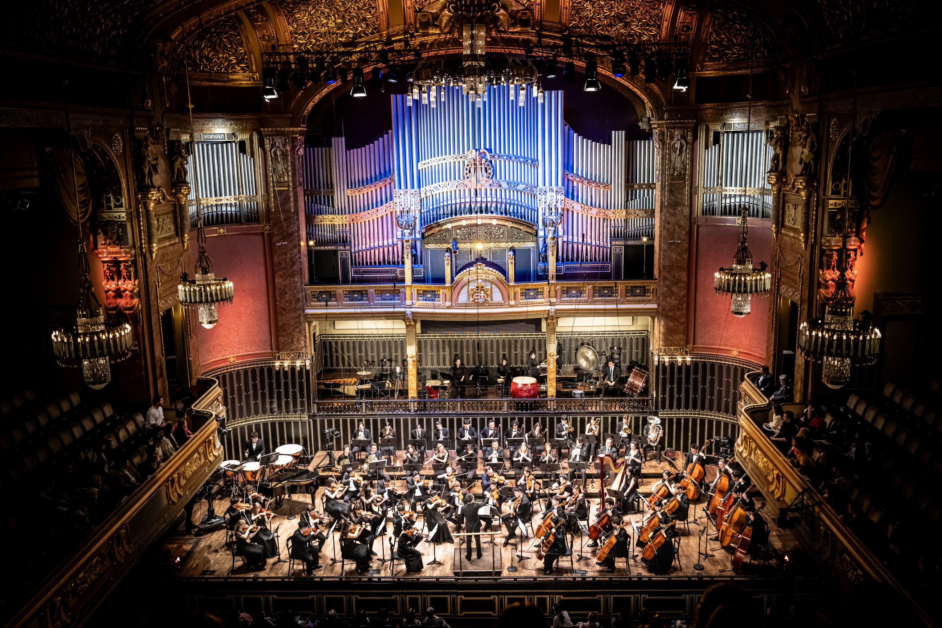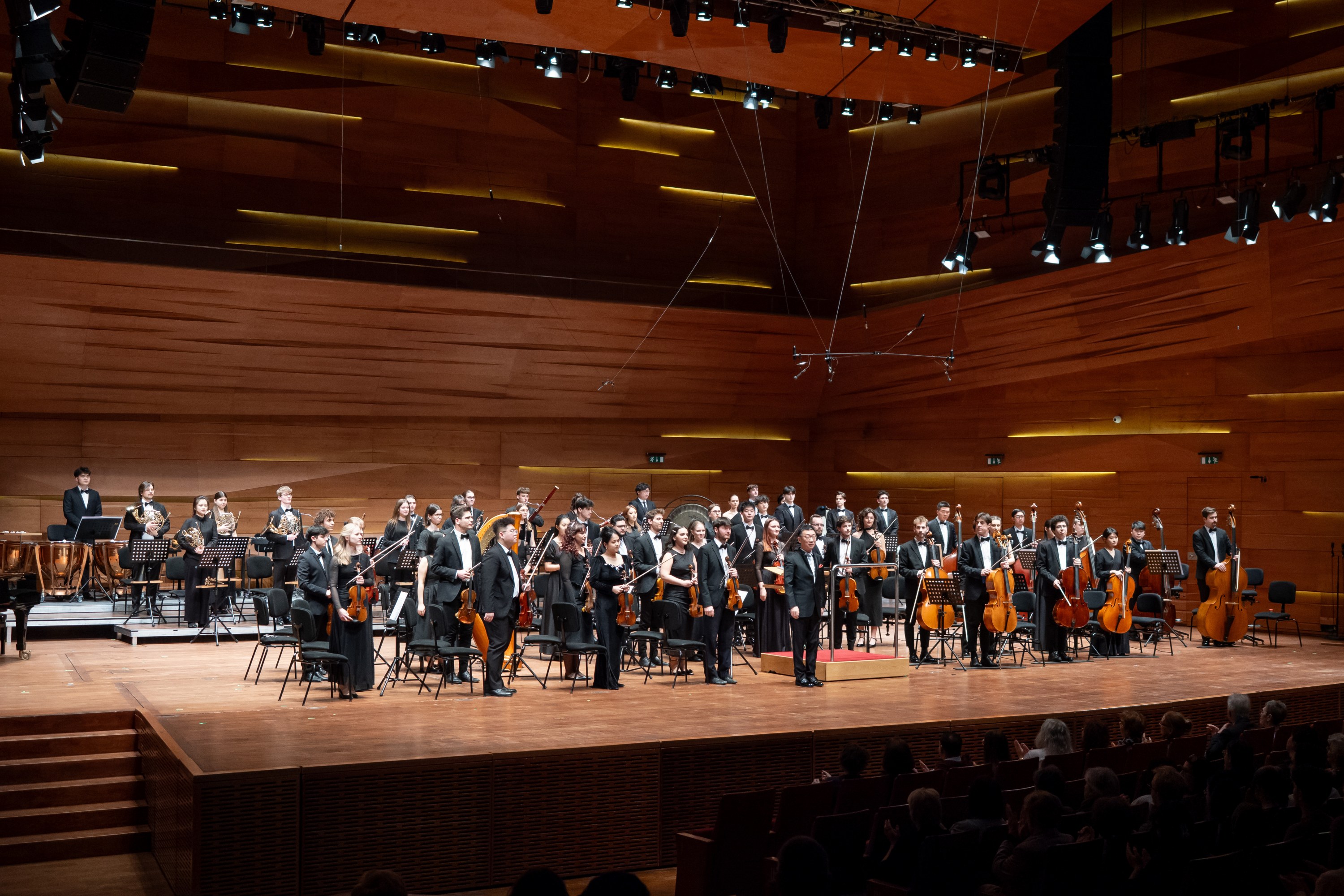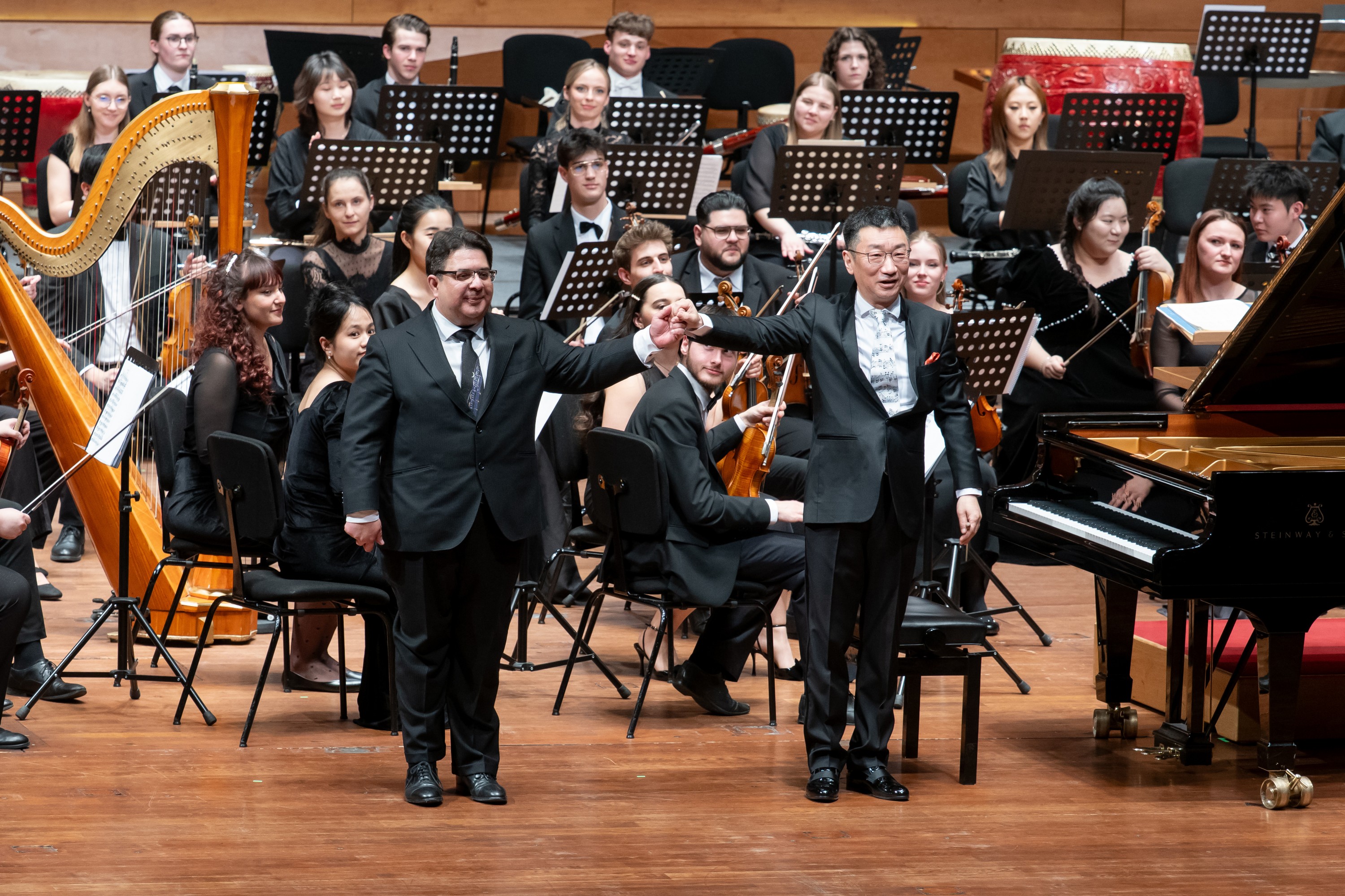3月25日晚,李斯特音乐学院音乐厅内座无虚席。这座由“钢琴之王”Franz Liszt于1875年亲手创立的音乐殿堂,迎来了中国音乐学院与李斯特音乐学院联合组建的70人学生交响乐团。中国驻匈牙利大使龚韬在致辞中指出,两校开展的联合音乐会、大师讲堂、学术互访等系列活动,正是中匈文明互鉴的生动写照。音乐会由中国音乐学院院长、指挥家李心草执棒。上半场,李斯特《第三交响诗〈前奏曲〉》的庄严旋律如潮水般涌出,瞬间点燃全场。随后,李斯特音乐学院院长Gábor Farkas担纲钢琴独奏,他的指尖与琴键浑然一体,与乐团默契演绎李斯特《A大调第二钢琴协奏曲》。